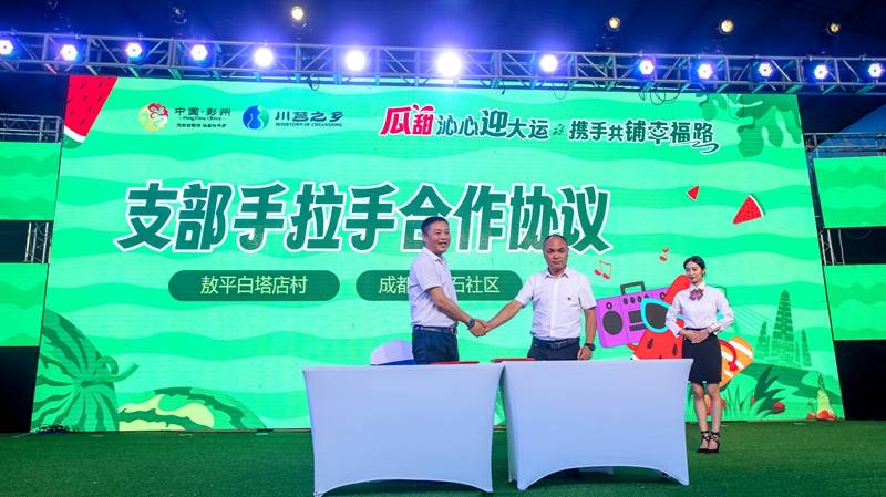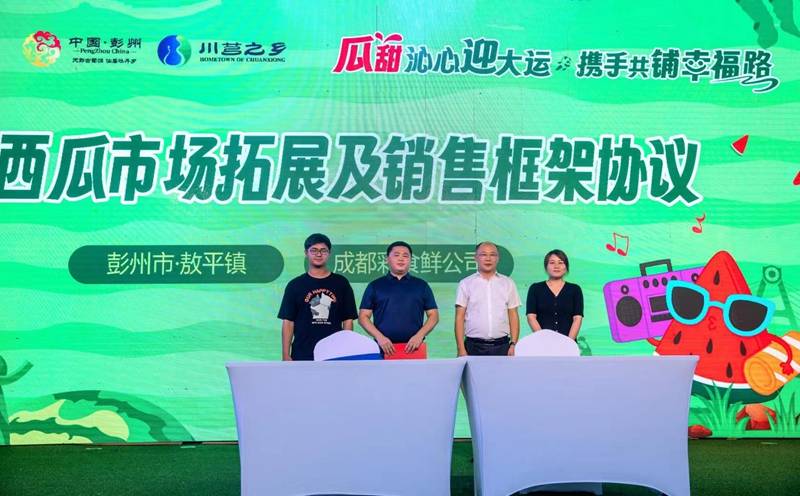 除了传统的歌舞观赏,互动游戏,今年西瓜文化旅游节开幕式还呈现三大特色:一是注重资源推介,镇领导卖力推介除西瓜之外的川芎、泉水、川西林盘、风筝、浅山旅游等文旅融合的产业;二是注重质量品牌,在开幕式上为敖平西瓜栽培提供技术支持的国家西甜瓜育种技术体系成都综合试验站站长、四川省“十四五”蔬菜育种攻关首席专家房超颁奖;三是加强与龙头企业合作,为民惠民,四川彩食鲜供应链发展有限公司与敖平镇签订西瓜市场拓展及销售框架协议,进一步拓宽市场销售渠道。