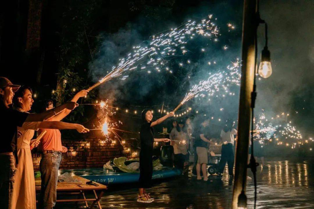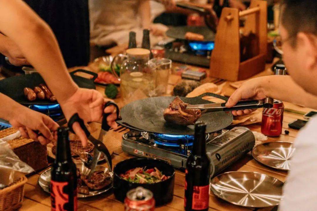 相比运动潮,这种潮生活更契合露营本源:临时咖啡、营地烧烤、海鲜锅、特色煲等美食是抚慰运动疲劳的最好补给,篝火晚会、露天电影、草坪KTV让身心继续放松。