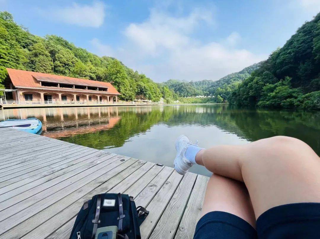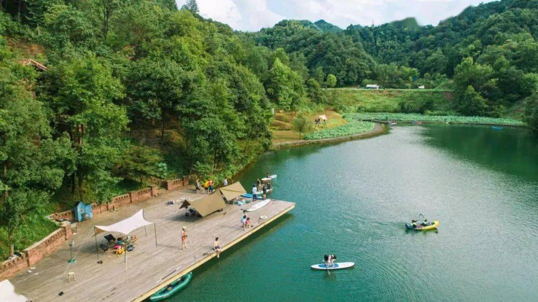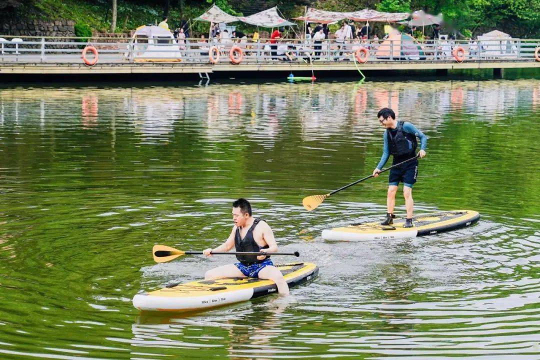 营地入口是一片约9600㎡的水域,在三面青山的掩映下,碧波荡漾。20块桨板有序铺设在平台上,令露营者饶有兴致,几名青年男女跃跃欲试,租板下水,在玲珑的柔波里,挥桨前行,激荡青春。