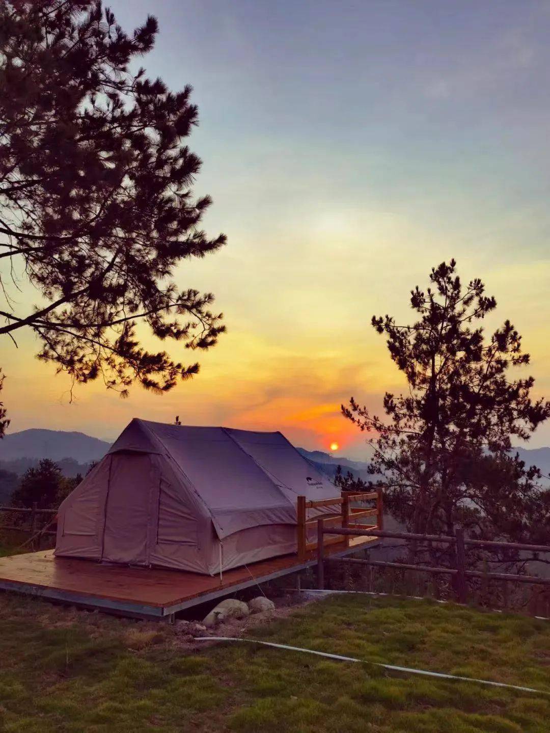 位于大明山景区海拔1000多米的万松岭上,住在森系美学的帐篷,坐在独有的“云端观景平台”上,喝高山下午茶,傍晚看一场日落,晚上再看场露天电影,烂漫极了。