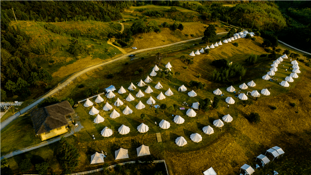 “森然之野悦林庄营地里不仅有45顶精致露营的酒店式帐篷,还配备了飞盘、蹦蹦床、德州扑克、桌游、篝火晚会、竹筒饭、烧烤以及周末驻唱歌手等活动,是临安的五星级营地,周六只要天气晴好,基本客满。这样的山顶营地,是我们未来主要打造的方向。”烽哥说。