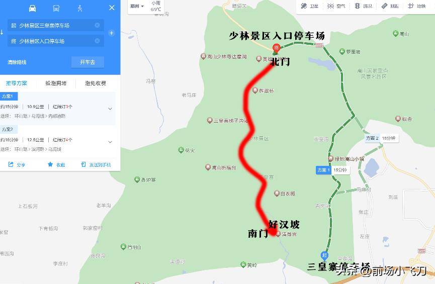 之前做攻略的时候看到很多人说少林景区有两条路线,一条是从少林寺进,三皇寨出,一条是相反。为了让大家更倾向于了解少林景区的路线,我特意标注了少林景区的两个出入口:少林景区入口停车场和三皇寨停车场。