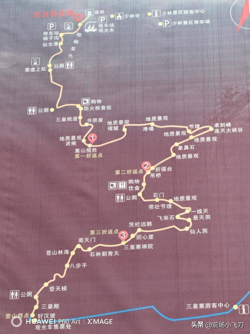 当然,很多人在少林景区停车场入口参观完少林寺,坐缆车游览书崖,很多人都是去吊桥再回来的。这也很好,而且少林游览路线明确标注了三皇寨的三个转折点:嵩山揽胜、吊桥和三皇寺。回头的话需要买少林索道的往返票,比较省力。