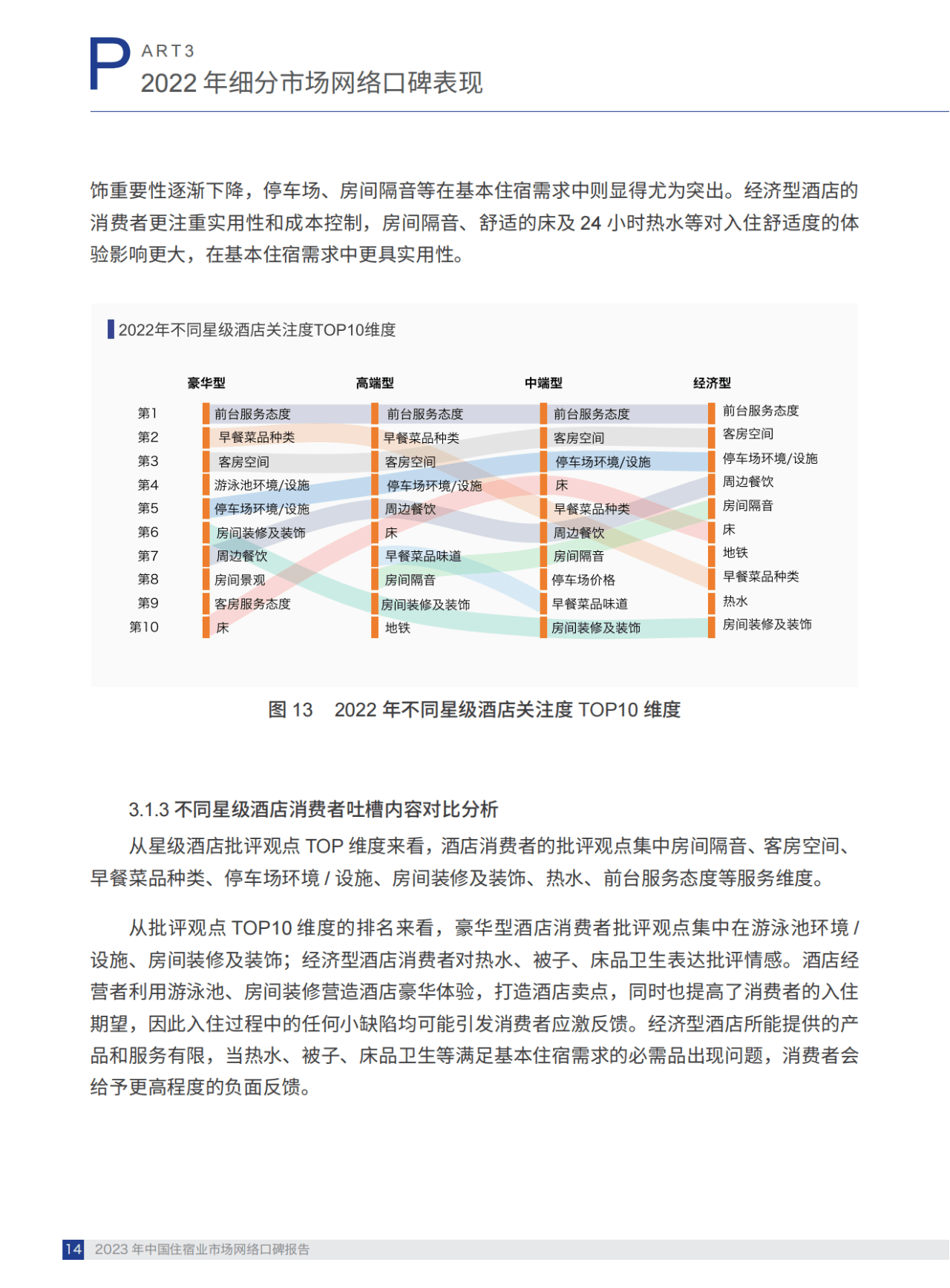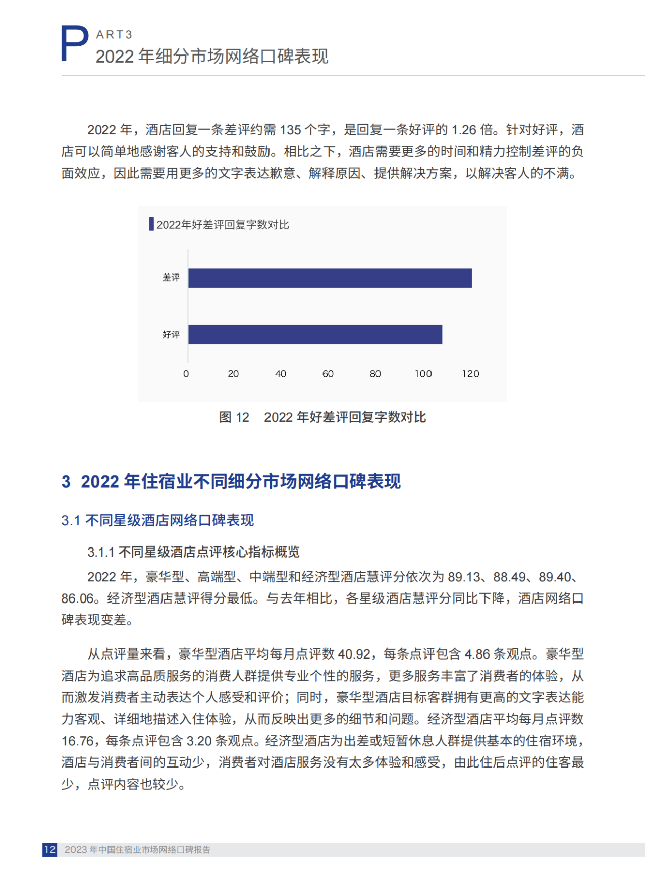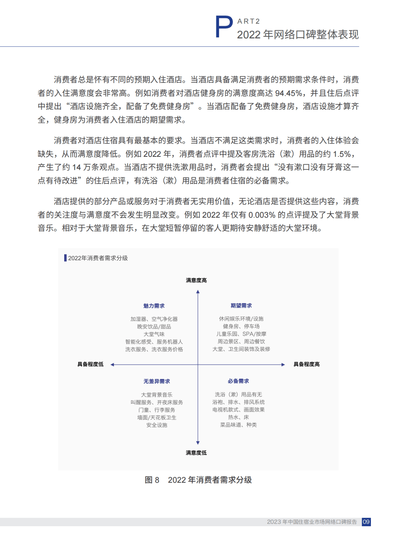 2023年中国饭店协会联合北京众荟信息技术股份有限公司第10次发布《中国住宿业市场网络口碑报告》,报告从点评内容出发,剖析消费者对酒店各项服务满意度的变化,对酒店软硬件服务关注点的变化,从而帮助酒店从业者客观地了解消费者需求变化,看清变化背后的机遇,为2023年运营决策提供参考。