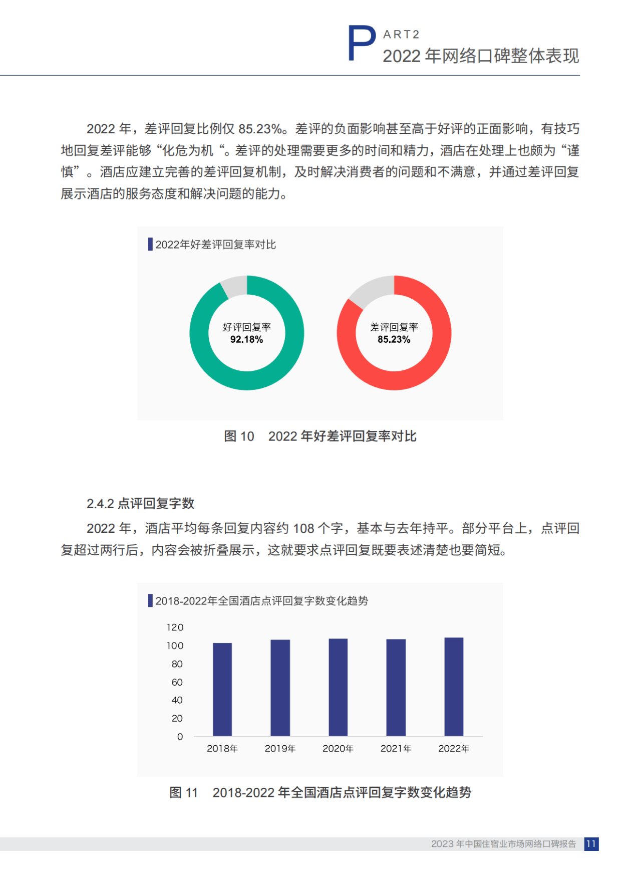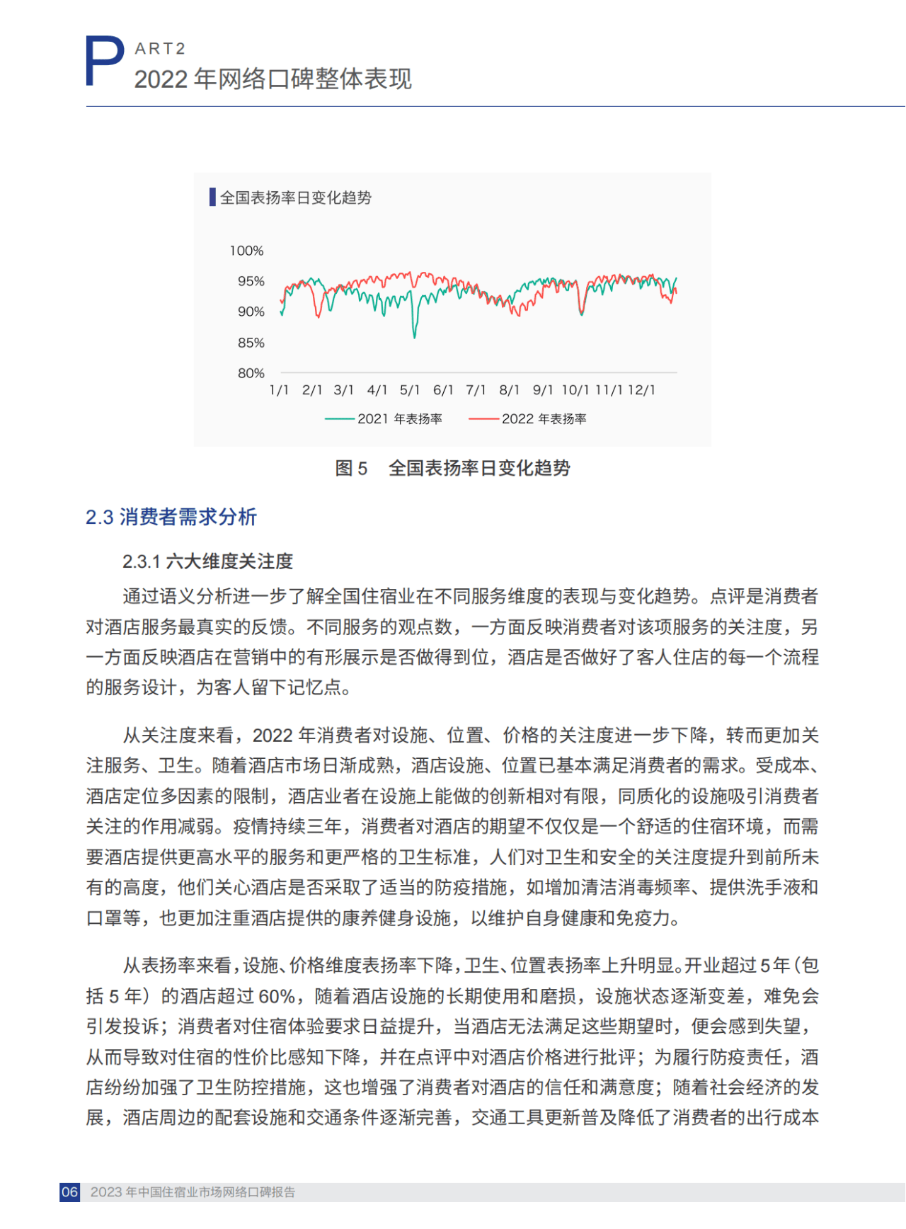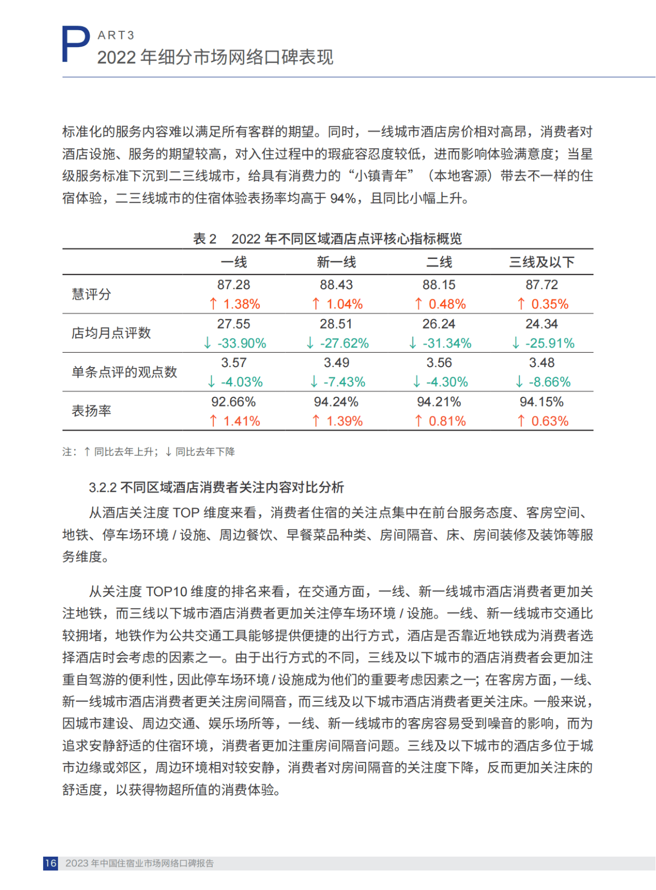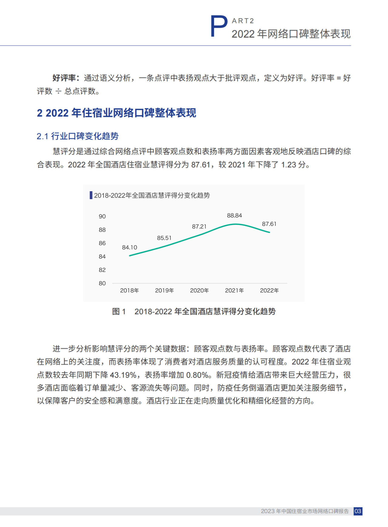 2023年中国饭店协会联合北京众荟信息技术股份有限公司第10次发布《中国住宿业市场网络口碑报告》,报告从点评内容出发,剖析消费者对酒店各项服务满意度的变化,对酒店软硬件服务关注点的变化,从而帮助酒店从业者客观地了解消费者需求变化,看清变化背后的机遇,为2023年运营决策提供参考。