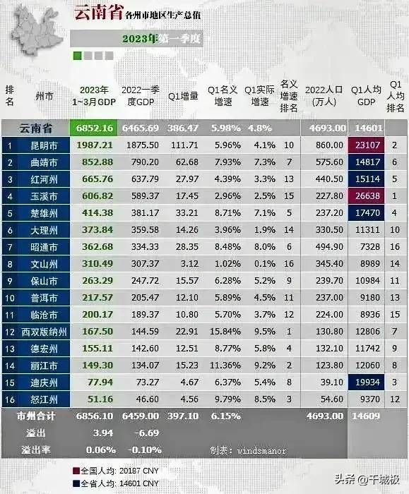 到2023年底,全省总人口将达到4693万人。今年一季度,云南省生产总值6852亿元,增长5.98%,略高于全国平均水平。云南省辖16个市州,也公布了GDP。你的家乡在上面吗?有没有让你惊喜的城市?