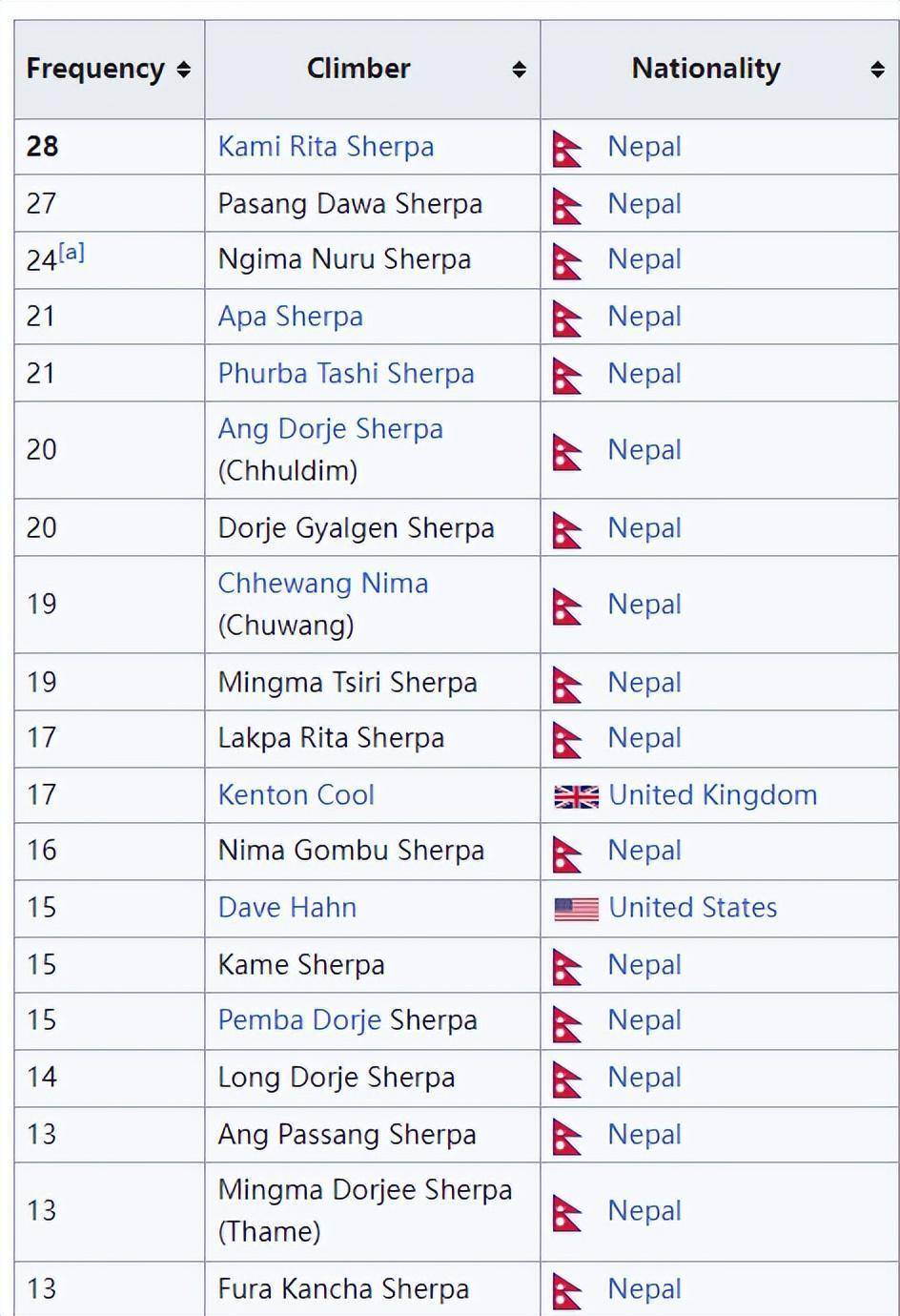 真正征服珠穆朗玛峰的是尼泊尔夏尔巴人。迄今为止登顶次数最多的人是53岁的向导凯米丽塔夏尔巴,28次,仅今年就两次登顶。巴桑达瓦夏尔巴人以27次获得第二名,所有夏尔巴人向导紧随其后,国外人排在第11位。