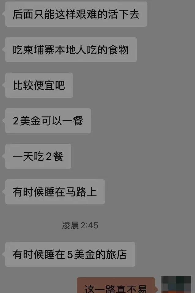 我不记得我吃了多少次2美金的柬餐,我也不记得我住了多少天5美金的宾馆,更不记得自己睡了金边多少条大街,只知道我时刻都不忘初心,我即便是最困难的时候,即便是饿的两眼发直头脑昏沉的时候,我也没有想过要进入园区,根本没有想过去做诈骗赚钱,因为我知道,那是一条不归路,一旦走上了,就不能回头了,所以我的底线就是这样,哪怕是饿死,也坚决不敢违法乱纪的事情,不管吃多少苦受多少罪,我心里都有一个信念,那就是我从小父母就教育我的那番话,人间正道是沧桑,千万不要做违法乱纪的事情,那样不仅仅是自己丢人,全家人蒙羞,就连后代都跟着遭殃。