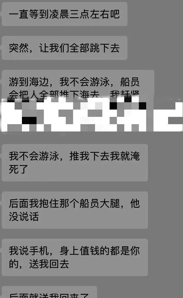 这是真的,这辈子我都没经历过这么恐怖的事情,大家闭上眼睛可以想象一下这个恐怖的画面,漆黑一片的夜里,一条渔船在海面上,200多米处才是岸边,探照灯不停的闪烁着,而船上的人一个个被推下海里,我不敢再想象下去了,我直接跪下,抱着一个越南人的大腿我就不松手了,随后我把口袋里的一把美金都掏出来了,大概也有两千多美金吧,看到我给这么多美金,这个越南人果然不再拉扯我下船,但是另一个又上来了,我看不行啊,赶紧把直接最新款的华为手机给了他,两个人这才不拉我了,我跟他们说,我要回柬埔寨,我不下去了,我回去。