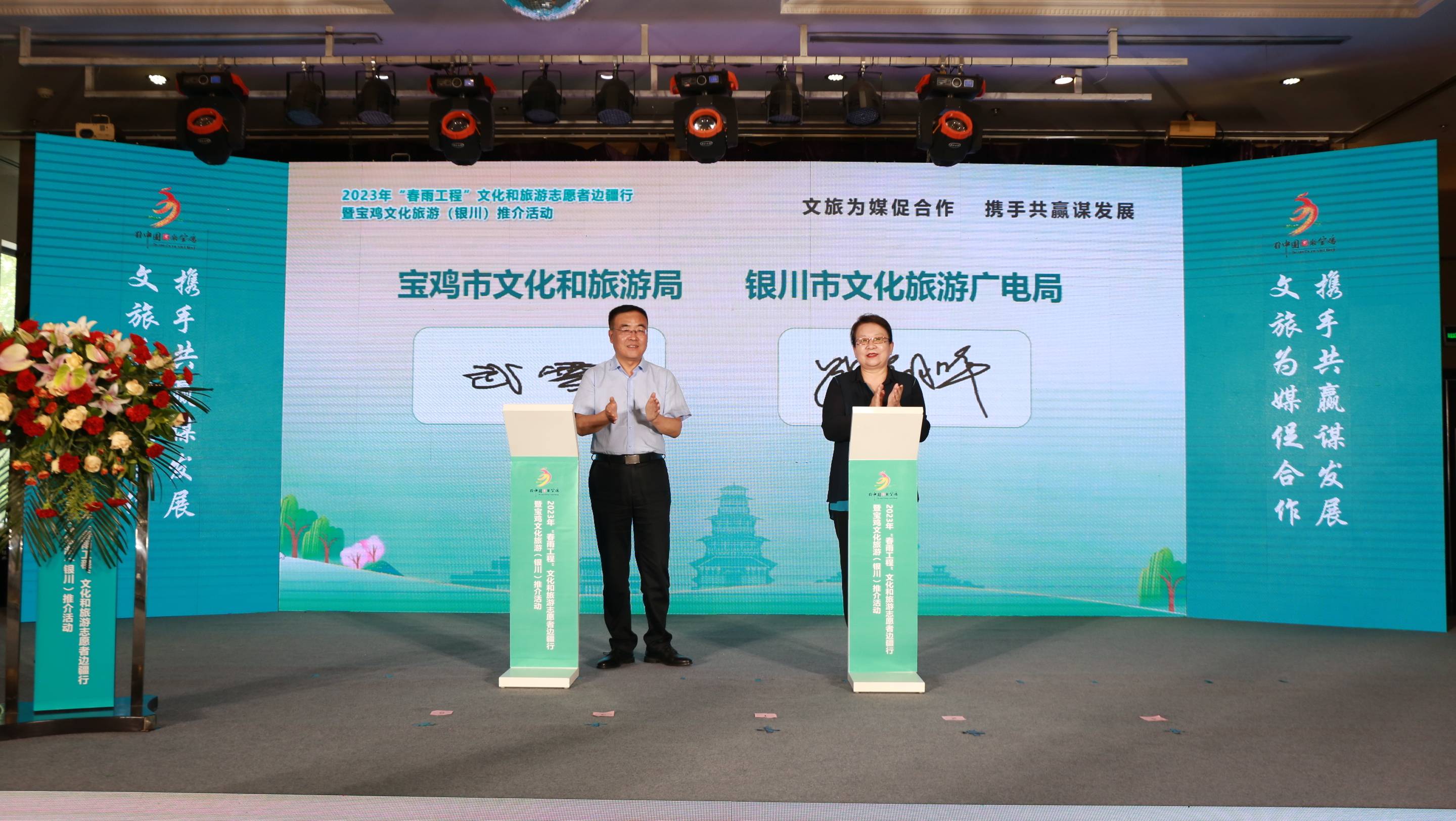 启动仪式上,银川市文化旅游广电局党组成员、副局长强朝辉致辞;宝鸡市文化和旅游局党组书记武云致辞;两市文旅局签署了文化旅游战略合作协议,宝鸡市法门文化景区、太白山旅游景区、关山草原景区、大水川景区、青峰峡景区、周文化景区分别与宁夏五洲盟票国旅、宁夏鑫领航国旅、宁夏康途国旅、宁夏中旅、宁夏山水国旅、宁夏新文化国旅分别签署合作协议,中共银川市委常委、纪委书记刘智峰、银川市人大常委会副主任冯伟斌、宝鸡市文化和旅游局党组书记武云、银川市文化旅游广电局副局长强朝辉等领导共同启动了2023年“春雨工程”文化和旅游志愿者边疆行暨宝鸡文化旅游(银川)推介活动。