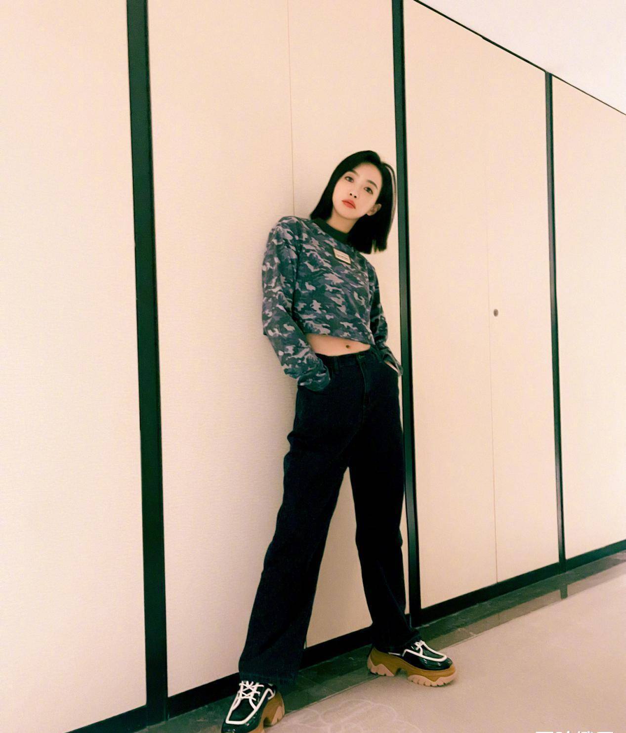 可能你不喜欢裤子紧身的设计,那么图中这款裤管宽松的黑色牛仔裤也是不错的选择,可以完美修饰腿型,任何腿部缺陷都能够被遮掩。宋茜还搭配了一件短卫衣,看上去时髦又利落,露出的腰部肌肤还突出了视觉上的层次感。