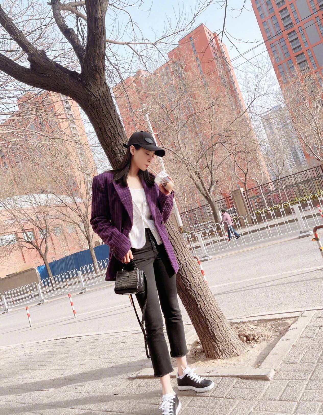 在这张图中,宋茜依旧采用了上紧下宽的穿搭风格,以紧身牛仔裤搭配深紫色小西装,轻松get时髦的出街穿搭。西服外套在肩部一直都采用立体的设计,在视觉上使肩线加宽变直,再搭配宽松板型,可以让宋茜不经意的流露出有气场的一面,轻松凸显女大佬范儿。