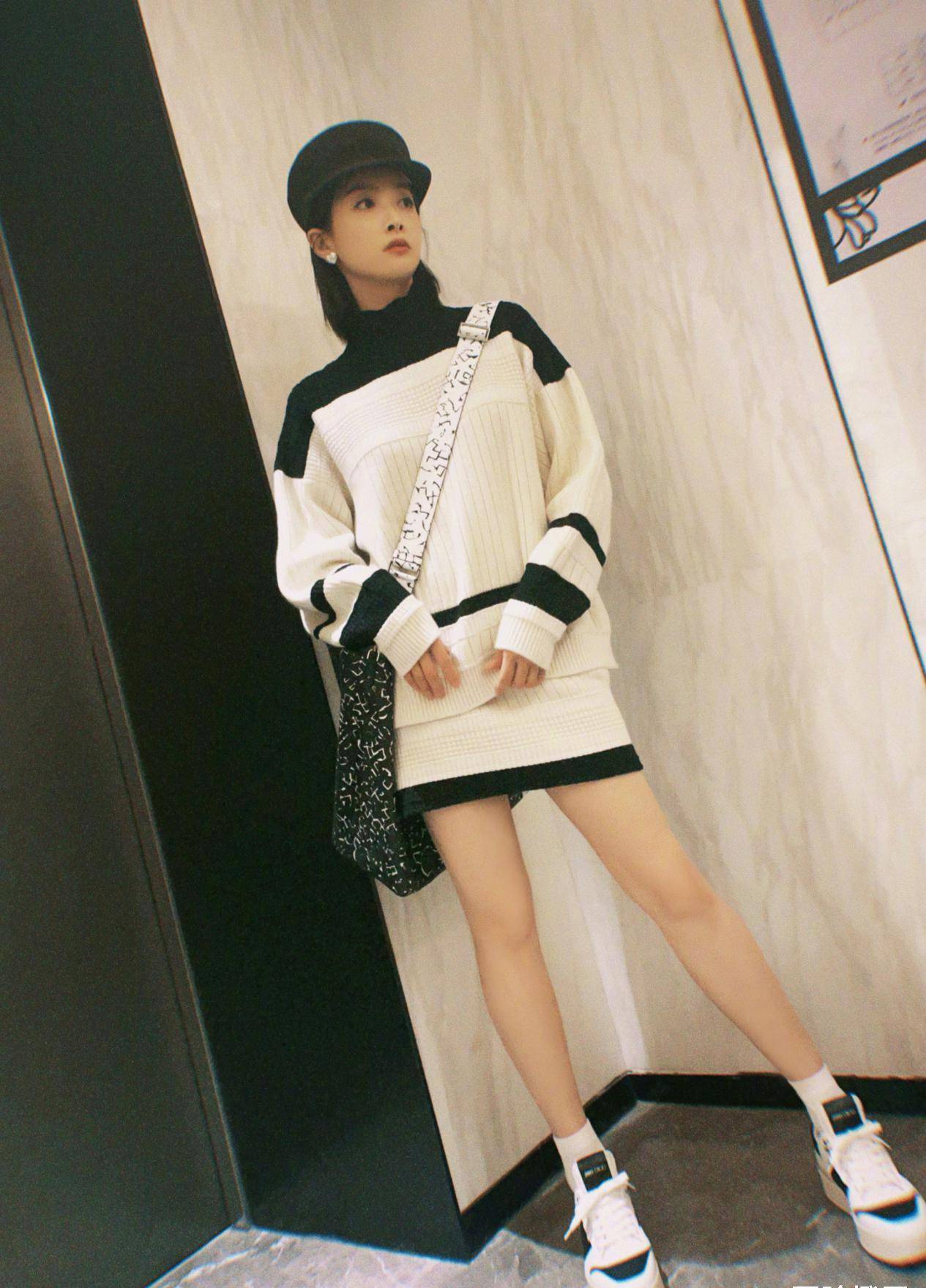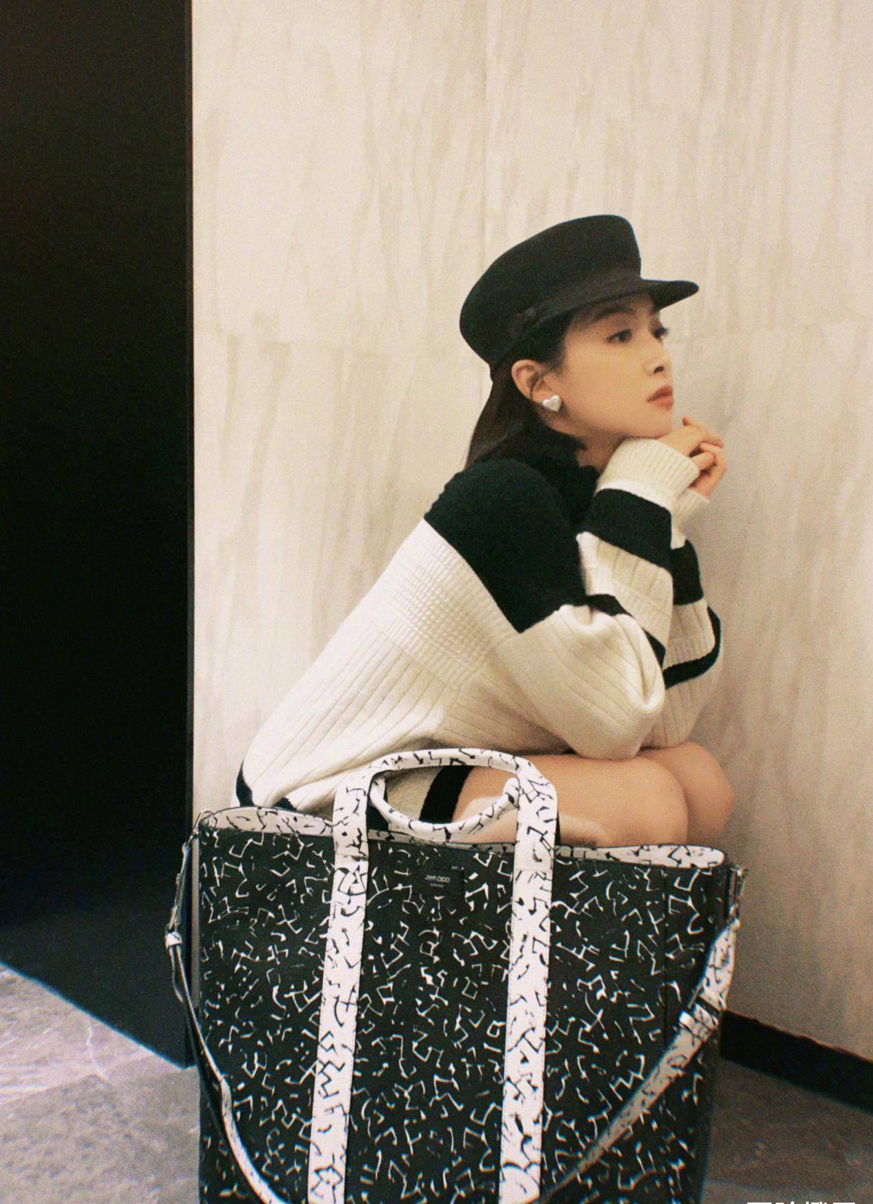 不同风格的色块拼接到一起,也能将它们的风格融合在一起,像是图中这款黑白拼接色的毛衣和短裙,就十分优雅时髦。宋茜还背了一个同样是黑白配色的托特包,与服装的颜色相互呼应,使造型更添整体感。