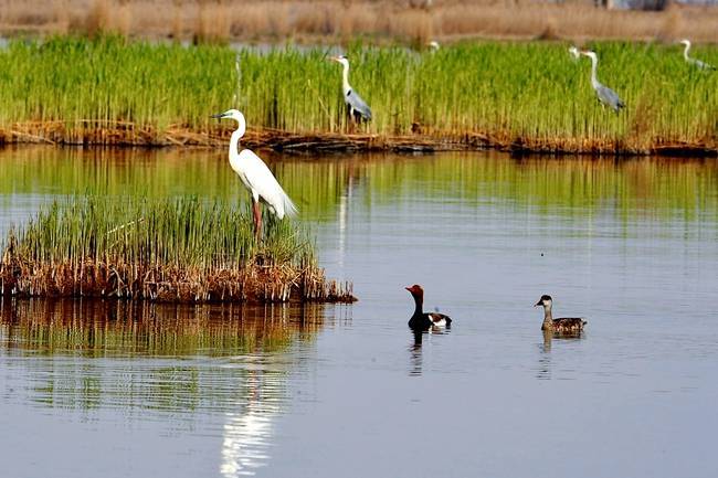 沙湖是中亚候鸟迁徙的重要中转站,全球9条候鸟迁徙路线中有3条路过中国,其中2条经过沙湖。这里良好的生态环境成为各类候鸟、留鸟的最佳栖息地和繁殖地,据统计,沙湖有鸟类17目44科200多种200多万只。既能看见国家一级保护鸟类大鸨、黑鹳、中华秋沙鸭、白尾海雕、金雕,也能看见国家二级保护鸟类天鹅、苍鹭、白鹭等23种野生候鸟。每当春暖花开时节,它们便成群结队飞往这里繁衍生息。到了深秋,小鸟经过夏天的成长,羽翼渐渐丰满起来,便和众鸟一同长途跋涉飞往南方,来年春天又飞回沙湖。
