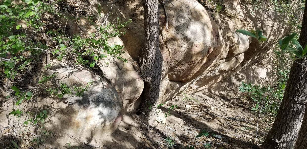 原来是花岗岩岩面矿物组成不均,集中成团的较软矿物(如长石类矿物)被风化剥蚀雨水淋蚀形成的天然图形(沟槽),远看如人工刻上的模糊“佛”字。