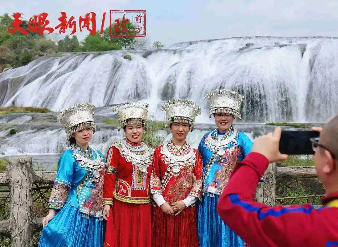 图为游客在黄果树大瀑布拍照留念。