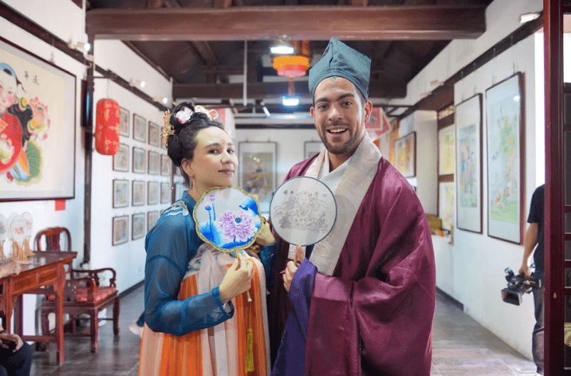 委内瑞拉博主苏小安(左)和吴瑞龙(右)身穿汉服打卡玉成号画庄 摄影 杨一