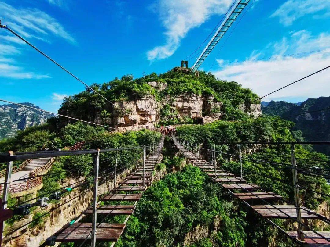 十渡民俗风情苑又名十渡誓言玻璃栈道,坐落于美丽的十渡国家地质公园。高空玻璃吊桥悬空而建,两山之间百米落差,漫步高空,惊险刺激而不失休闲惬意,全长131.4米寓意一生一世。