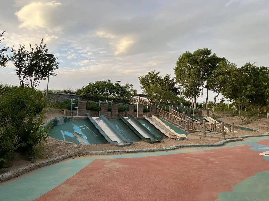 步道两侧绿树葱茏,间或会有一个小广场,有一些小型游乐设施,带娃走累了,可以随时玩一会儿。