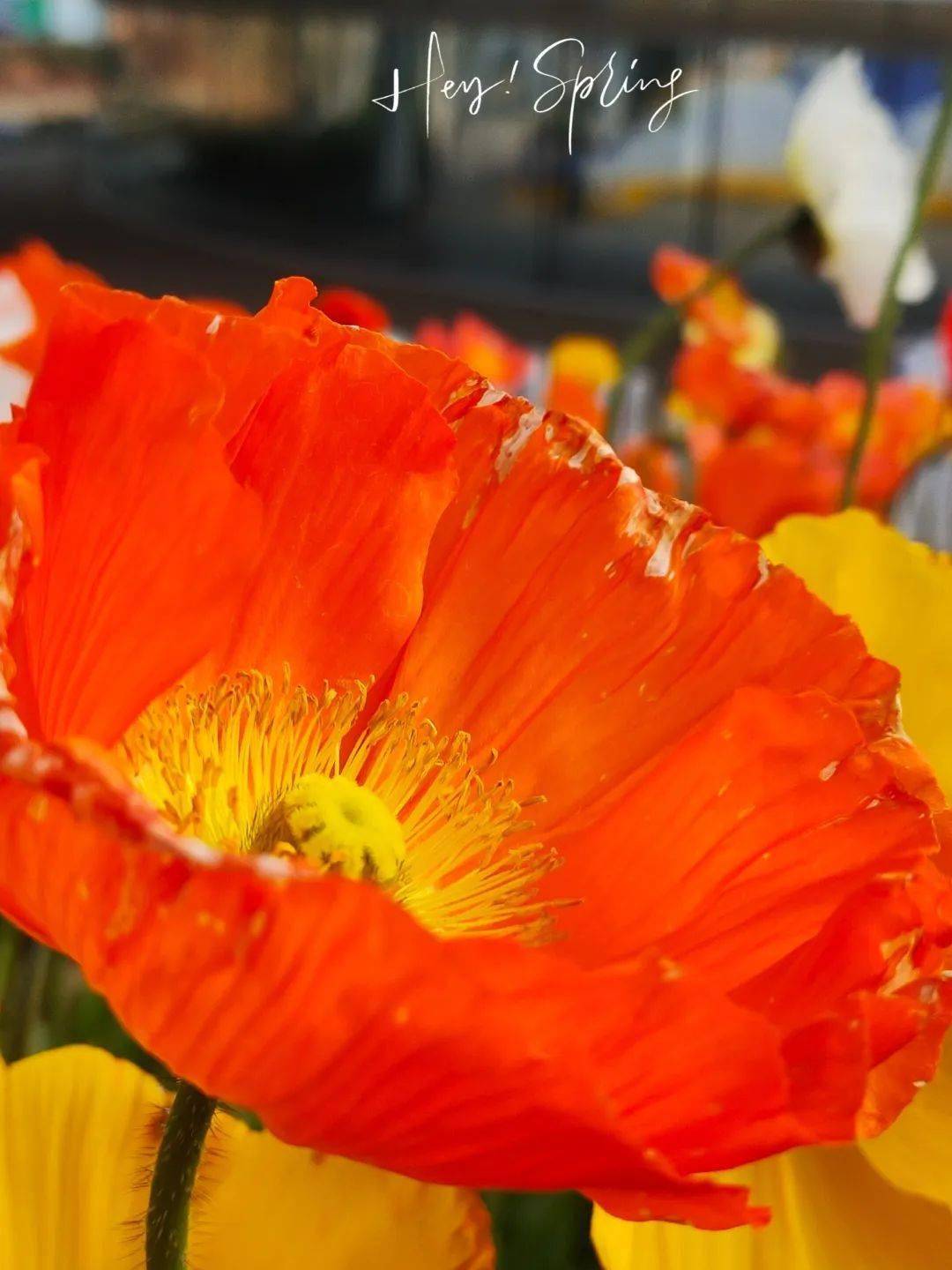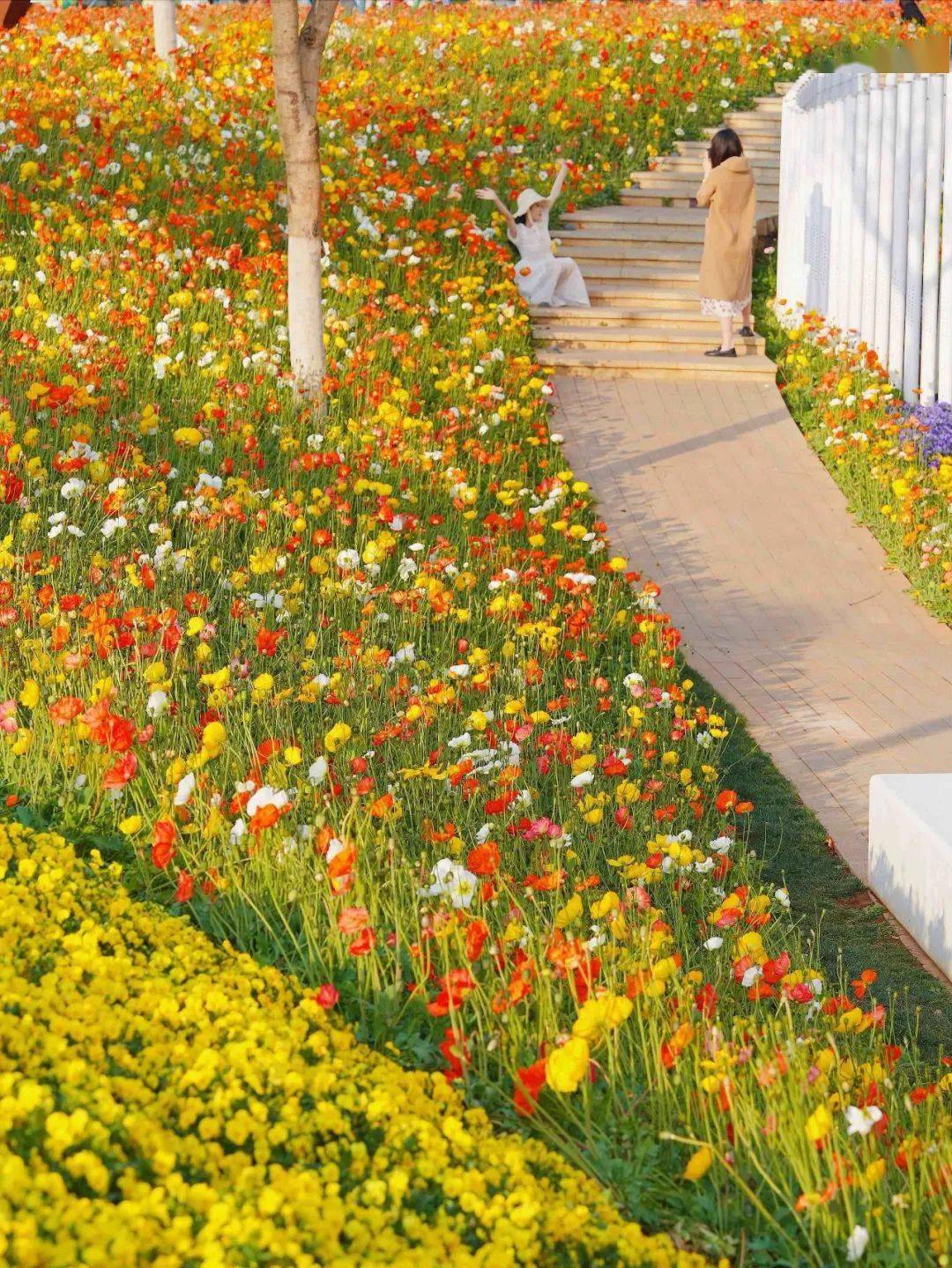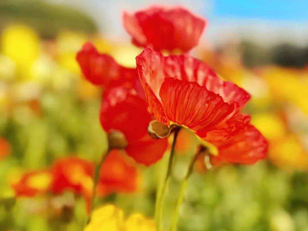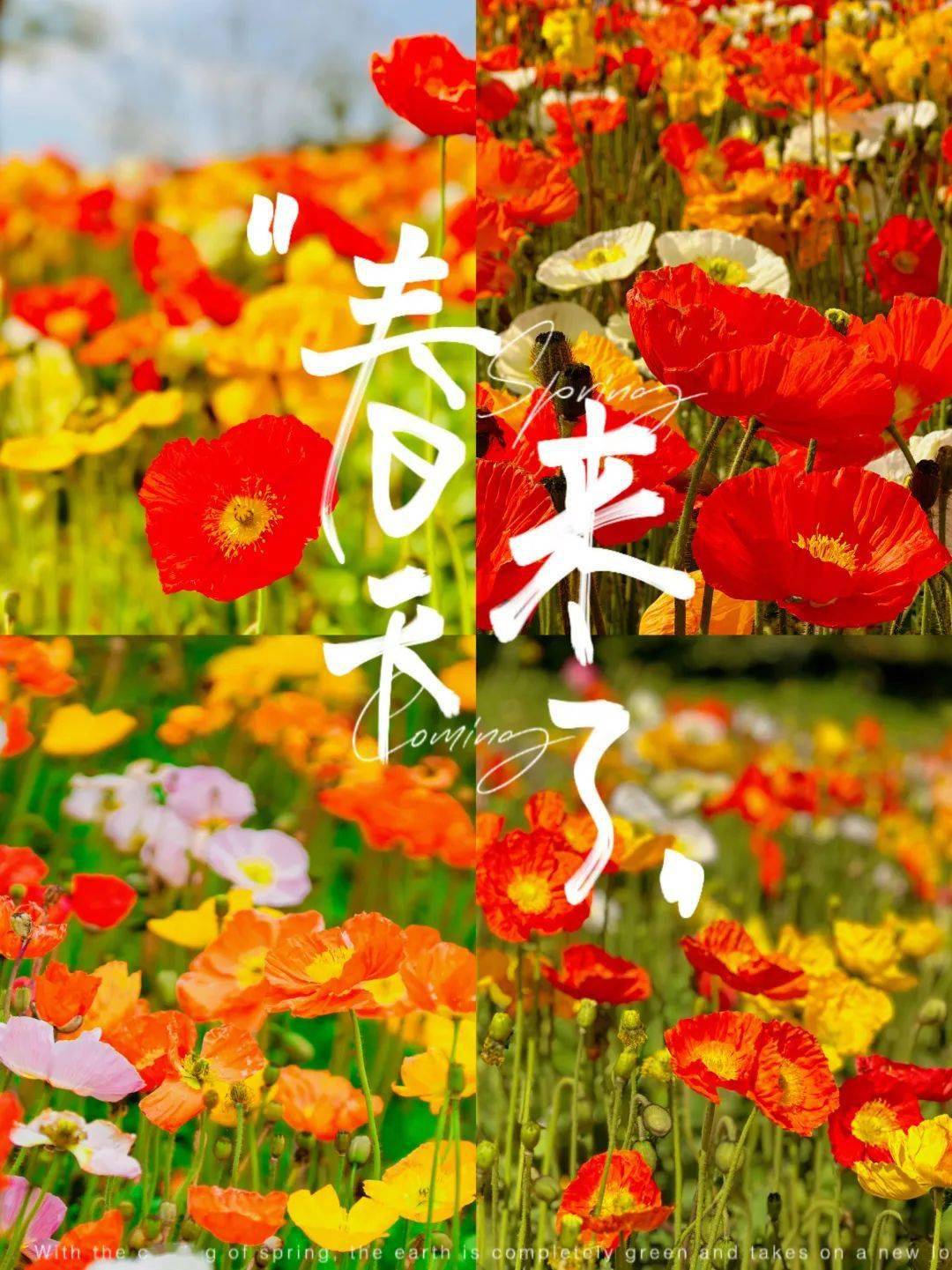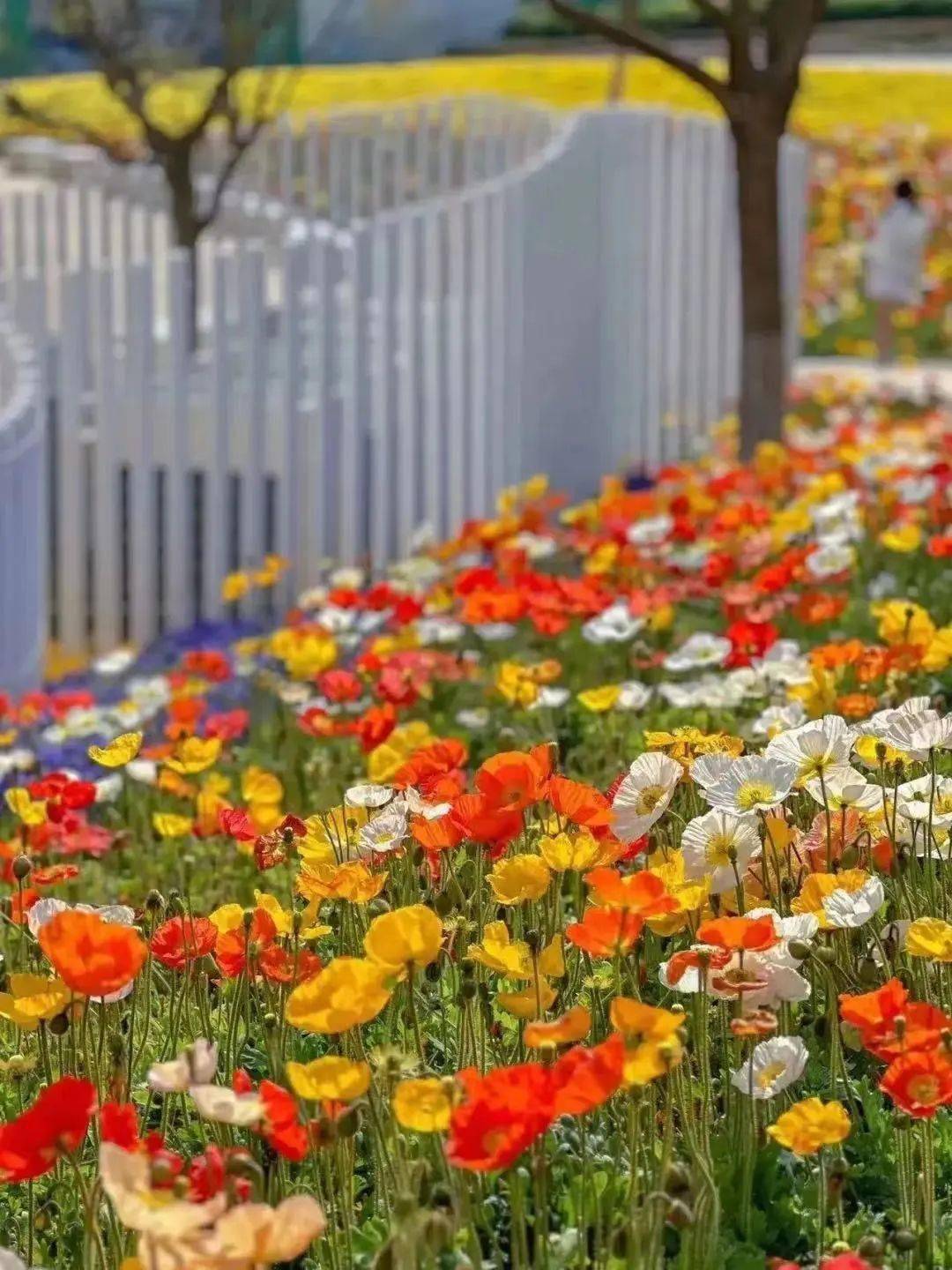 明晃艳丽的虞美人,在 花园大道铺出万千靓丽,红白黄三色锦簇,轻盈明丽的模样,春天也为之倾倒。