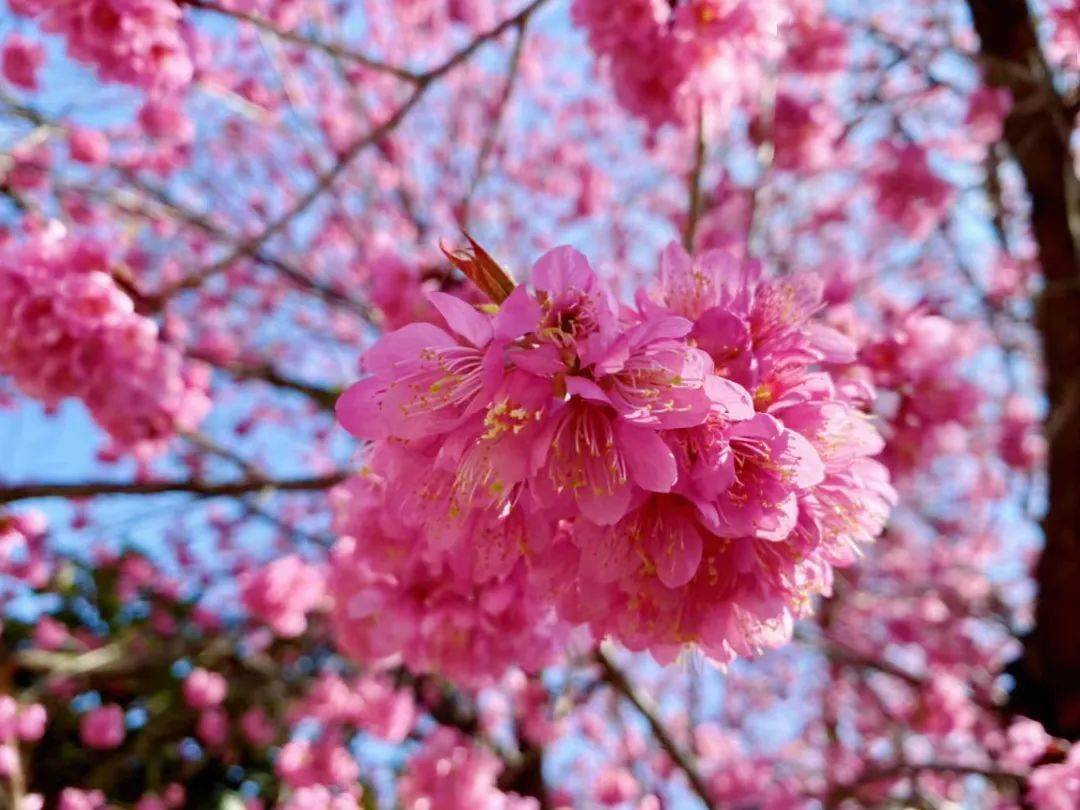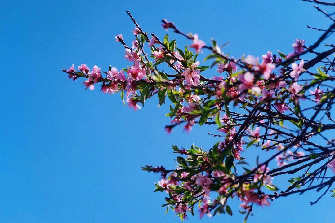 一树树的粉白连成一片,在枝头低吟浅笑,春满枝头的佳期恰逢晴空万里, 蔚蓝的天空过滤了一切杂色,只留下浪漫粉填充着这抹绛蓝。
