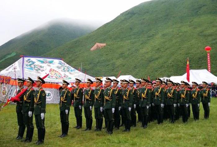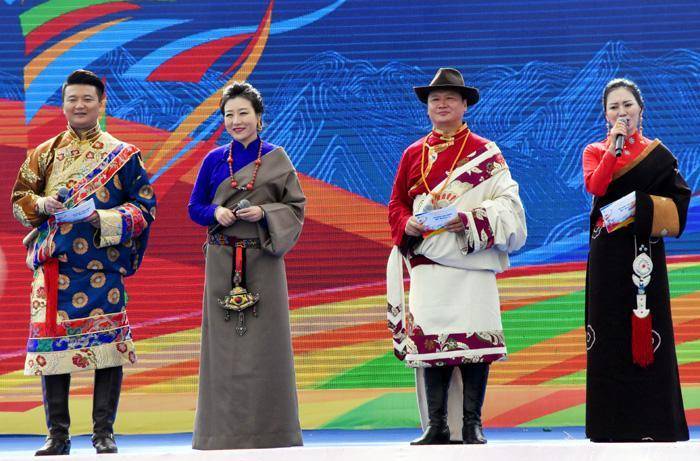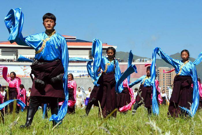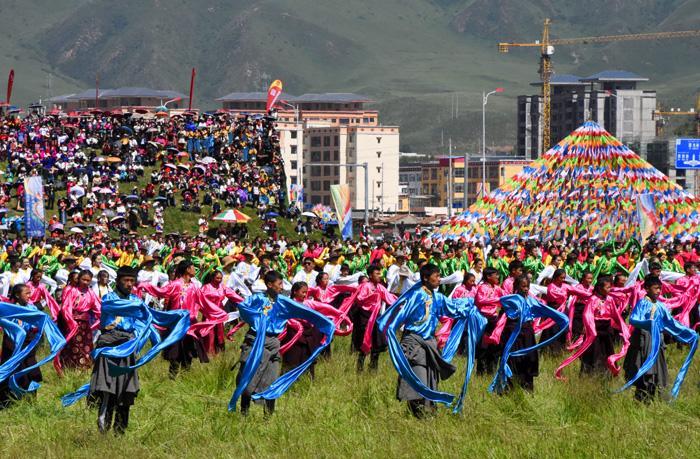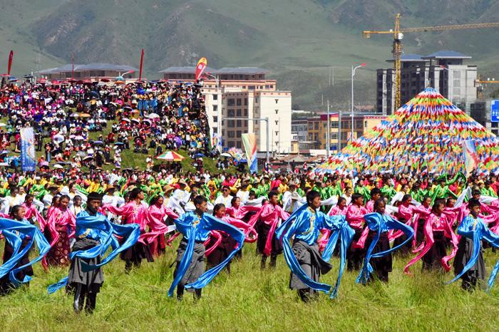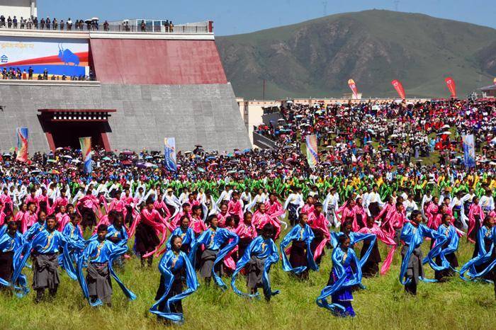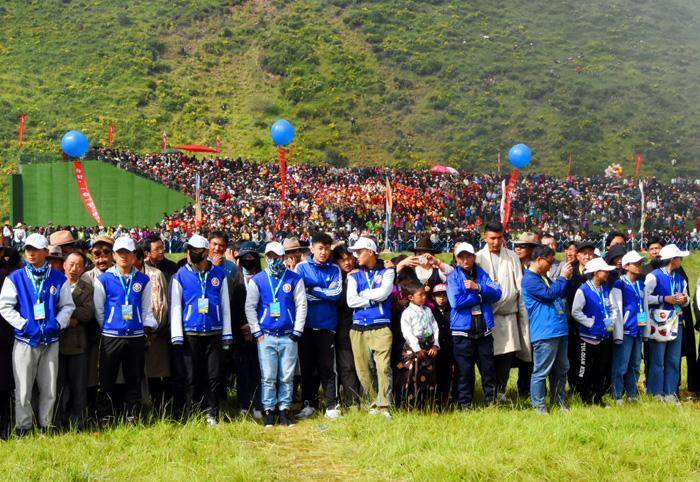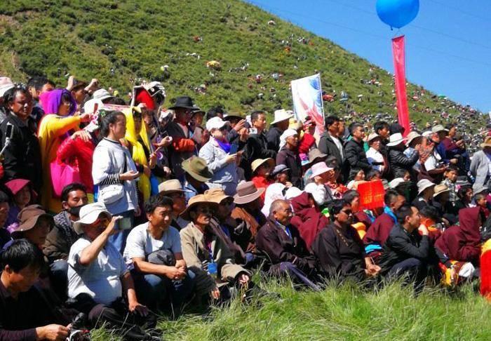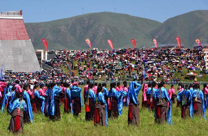 只见这里无论草原还是山上到处搭着带有浓郁民族特色的帐篷,五颜六色的经幡迎风飘舞,构成了一道道靓丽的风景线。开幕式首先进行庄严的升国旗唱国歌的仪式,万人肃立动情的齐唱景象感人振奋。之后在藏汉两族主持人的联袂主持下,精彩纷呈的藏族歌舞轮番登场表演,热烈的掌声与喝彩声此起彼伏,在草原上空久久回荡。