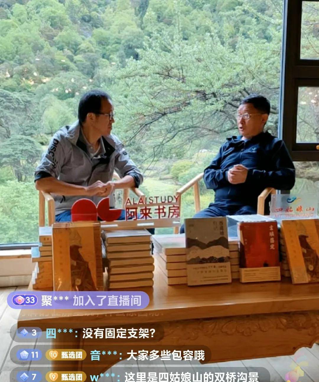 俞敏洪老师和董宇辉受阿来老师热情邀请前往四姑娘山,今日因宇辉有高反且又喝了点酒没有起来,俞敏洪老师和阿来老师两人先在阿来书店闲聊,顺便推荐了几本阿来老师的书籍。