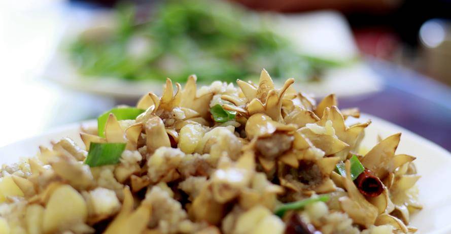 大理人除了种花赏花,还有吃花的生活习俗,其中就有茉莉花炒虾,也有大部分人都喜欢的玫瑰花鸡蛋饼,小马也吃过云南的鲜花饼,各种口味,吃起来除了香甜,还有鲜花的清香,而石榴花炒火腿也是大理人特别爱吃的,口感爽脆,非常下饭。