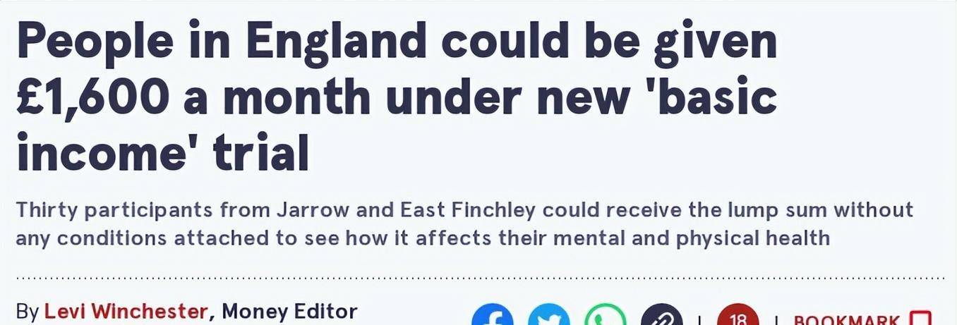 我们先来谈谈钱的事情。作为老牌资本主义国家的英国,不少人会觉得,它应该不至于缺钱。据英国卫报和天空新闻最新消息,英国将开展一项名为“全民基本收入”的实验,即:向参与者每人每月无条件发放1600英镑,并以此监测这一“全民基本收入”试验对人们生活的影响。