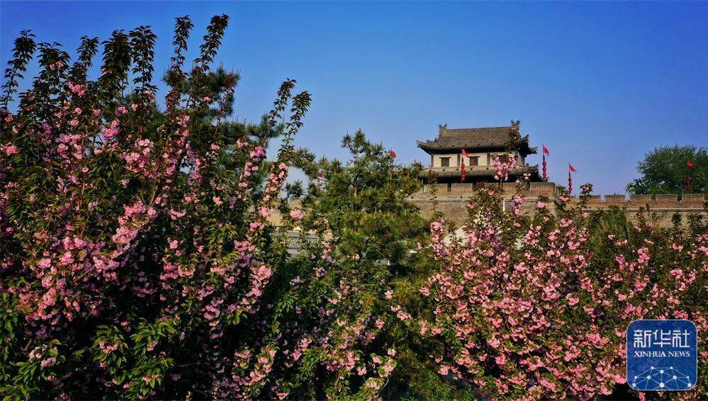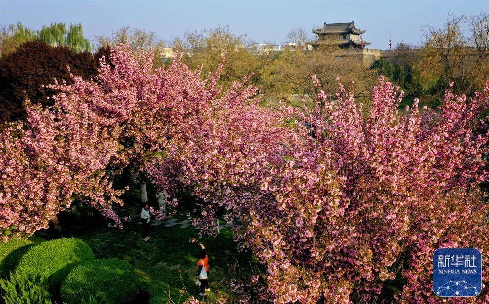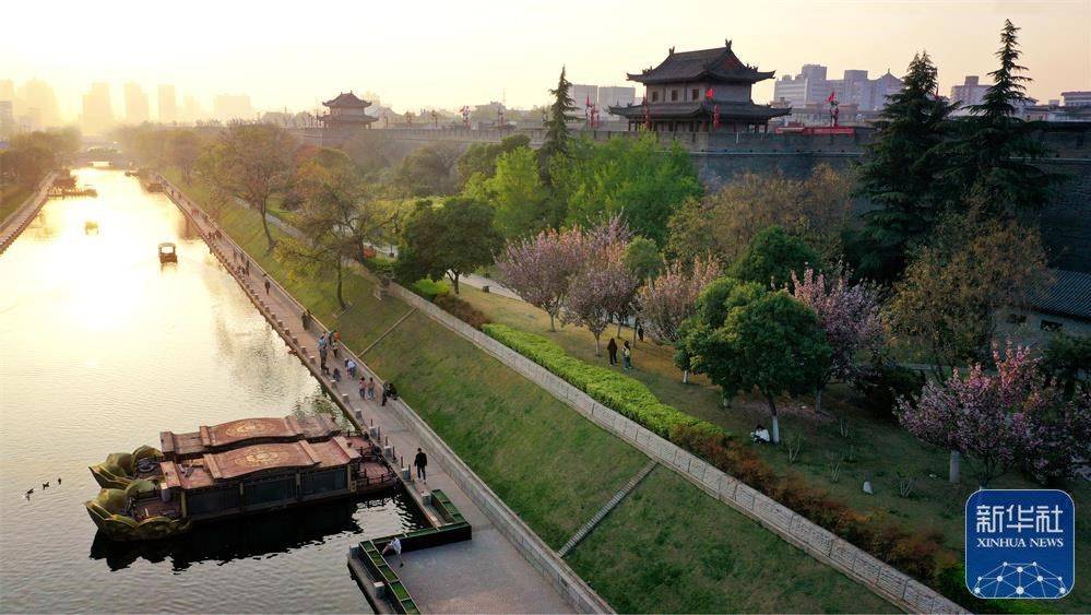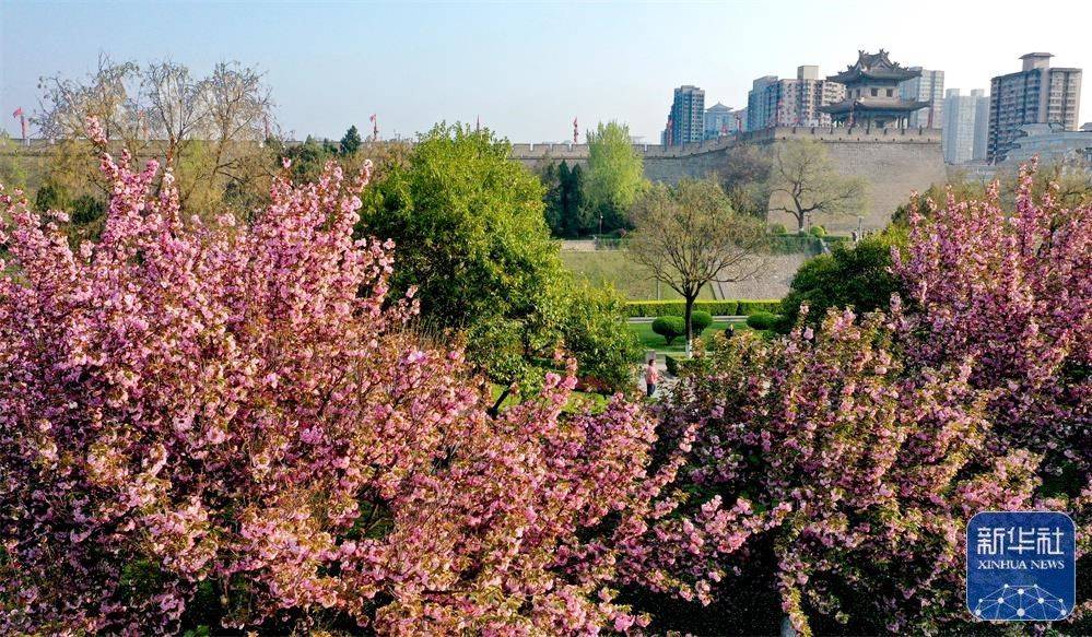 西安城墙掩映在繁花之中(4月1日摄,无人机照片)。新华社记者刘潇摄