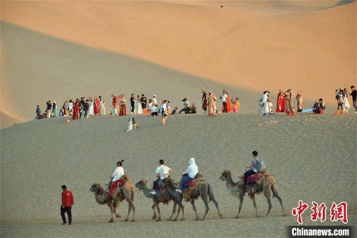 6月以来,在“人流如潮、驼队如龙”的敦煌大漠里,很多敦煌舞爱好者涌向敦煌,穿上以飞天服饰为代表的各种古装,在丝绸之路旅游网红“打卡地”鸣沙山月牙泉、玉门关、阳关等景区拍照、直播,各种不同的古装服饰也为“大漠孤烟直”的丝路古道增添了无限色彩。