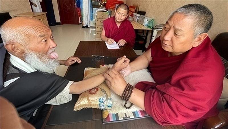 卡加藏药创始人、甘肃省甘南藏族自治州合作市卡加曼藏医院院长、藏医主任医师丹巴尖措(右)在为患者贡切热旦大爷认真把脉、问诊。