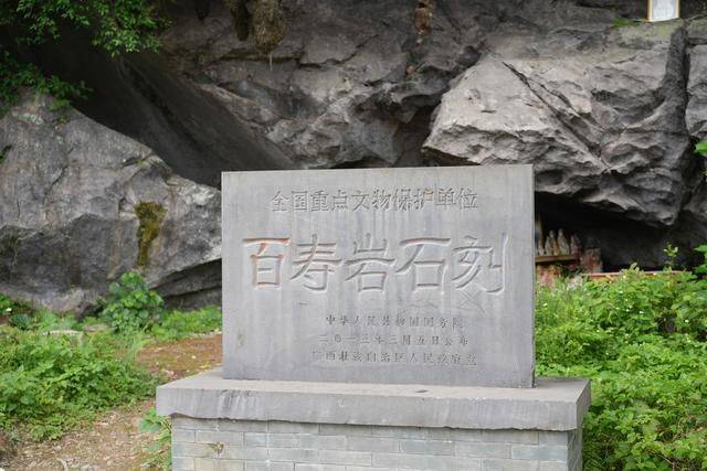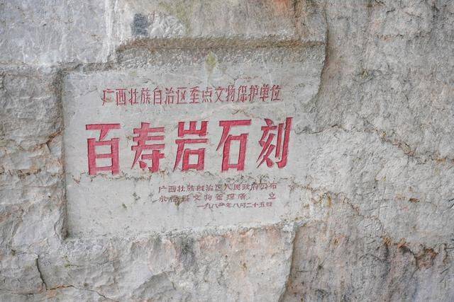 百寿岩是永福县备受推崇的人文景观之一,在岩内西壁上有一个大“寿”字石刻,高175厘米,宽148厘米,大寿字中还嵌刻着真草隶篆一百个小寿字,因而被称为百寿岩。
