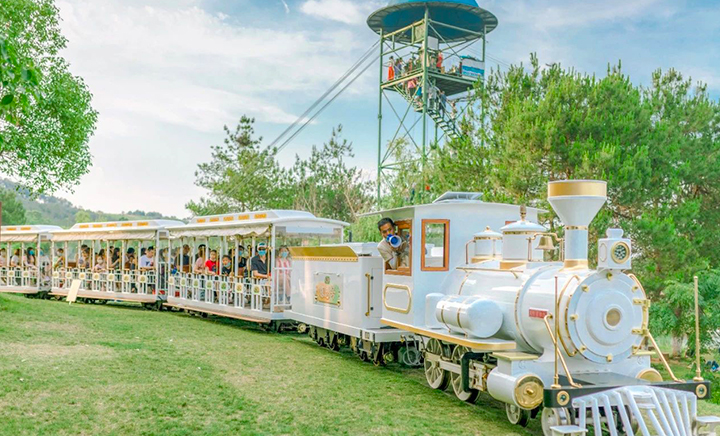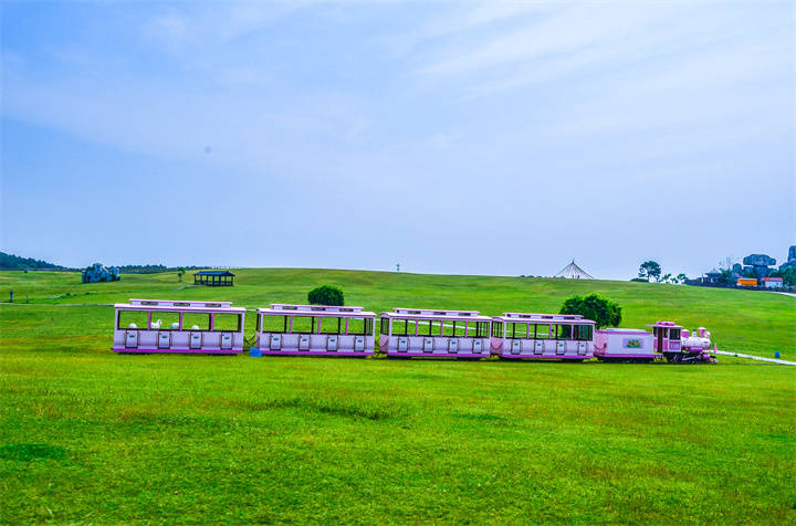 小火车共有三色,蓝白粉轮流发车,一条铁轨串联起草原里的各个项目。火车内部为全木装修,座位旁无窗,可以自由吹风。