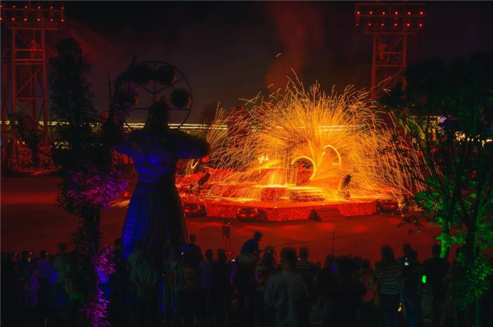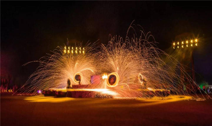 最厉害的就要数非遗传统艺术表演「打铁花」,颇为惊险、壮观。 匠人拿着木勺子甩沸腾的铁水,瞬间炸出无数朵金色的“花雨”,一勺又接一勺,一瞬间如白昼一般,把整个夜空都照亮了。