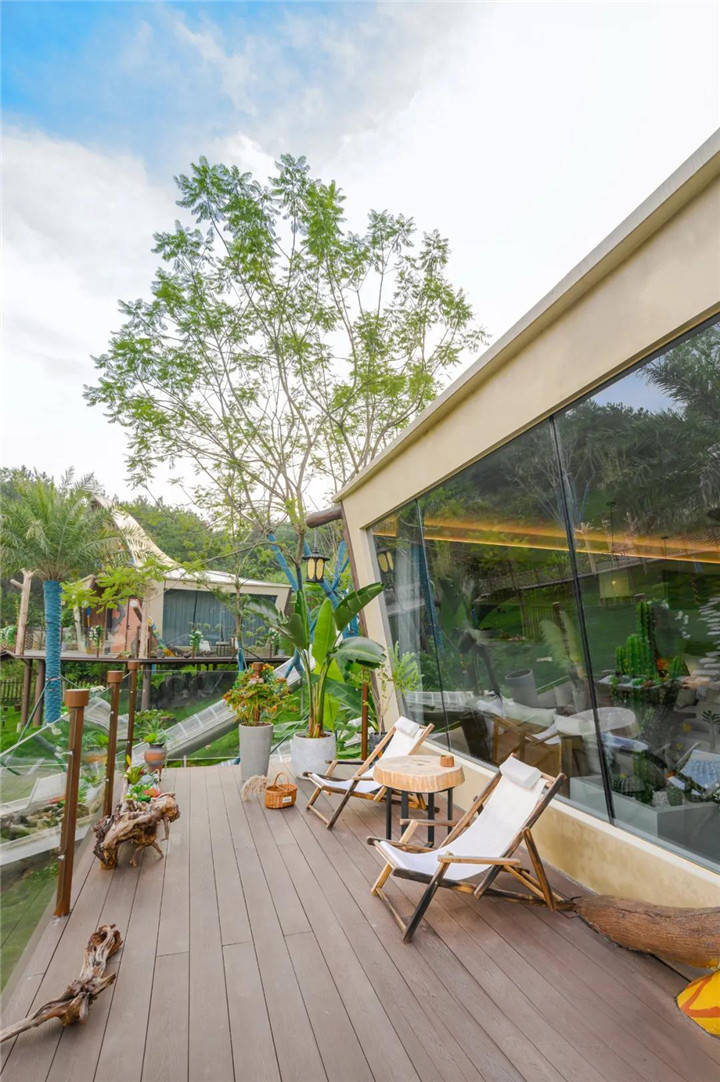卫浴干湿分离,玻璃能一键雾化。床头开关按钮也智能,按一下“睡眠模式”灯光渐渐变暗、窗帘缓缓合上。即便窗外是艳阳天,也能窝在床上睡懒觉。度假在此,尽享野奢体验。