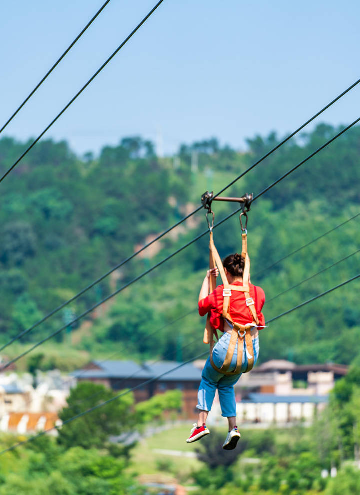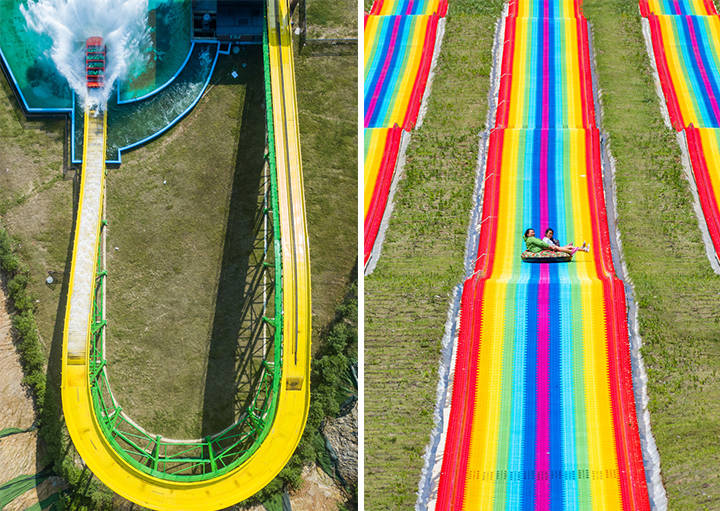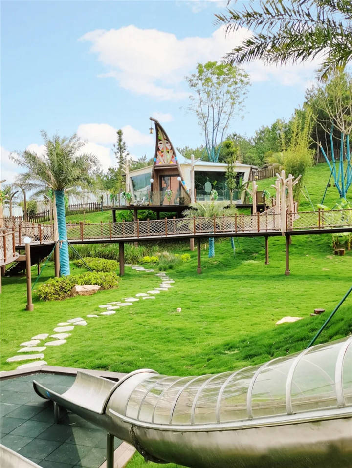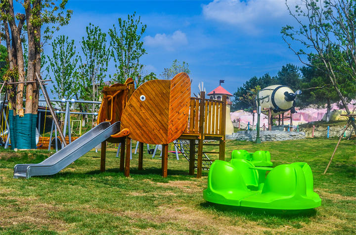最高的山坡上,七彩滑道能滑草,风声过耳,激流勇进的小船加速,水花飞溅,远远就能听到尖叫欢笑声。