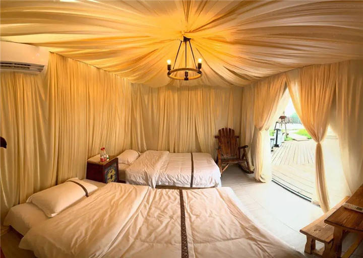 军帐分大床、标间,基础配套齐全,24小时空调、5A级豪华旅游厕所和洗浴空间,野外露营的吃住和洗漱问题一站式解决,感受野奢度假。