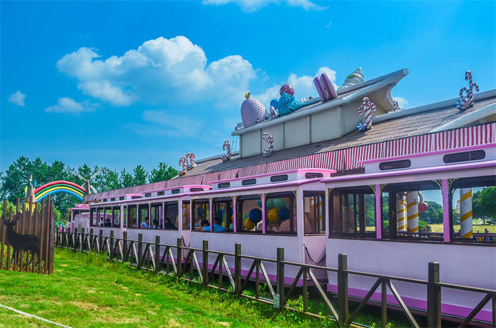 汽笛声响,小火车开动啦,小火车即将驶入梦幻童话镇。 两旁的巧克力山如放大了N倍的石头糖,大蛋糕们被喷上了马卡龙色系糖霜,体验少女心化掉的声音。
