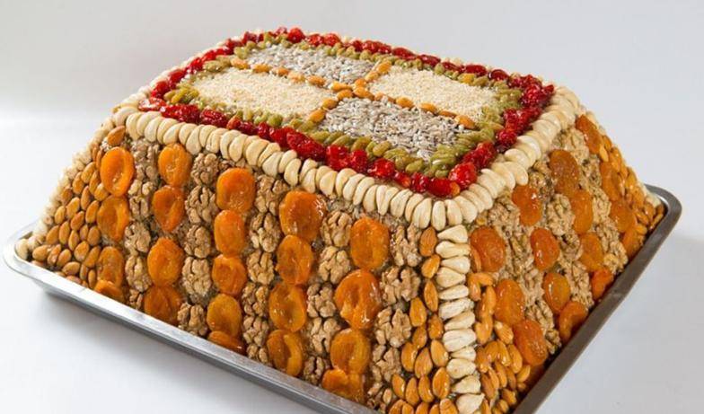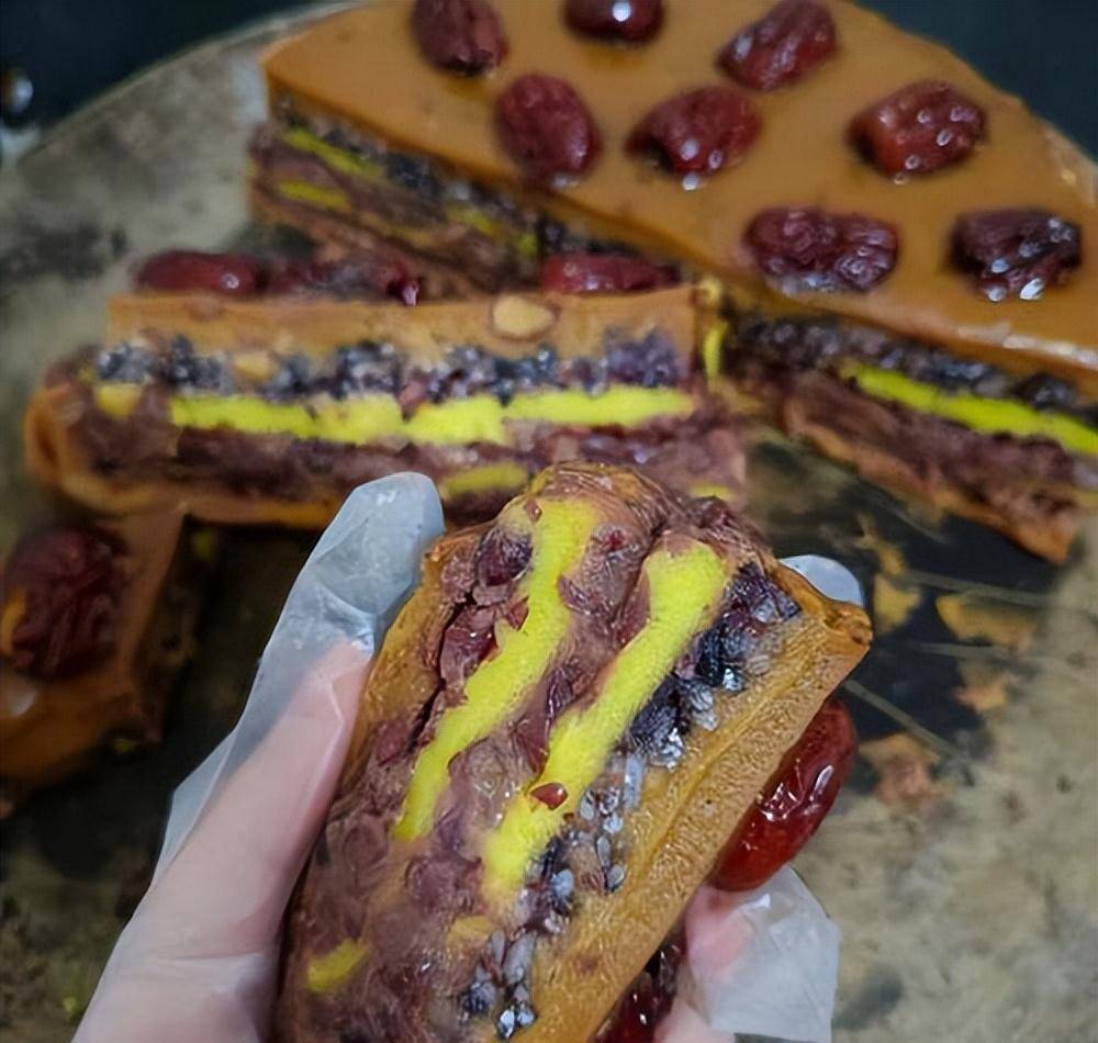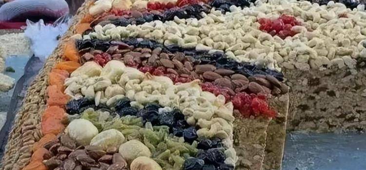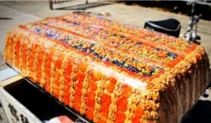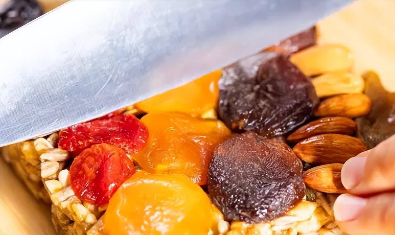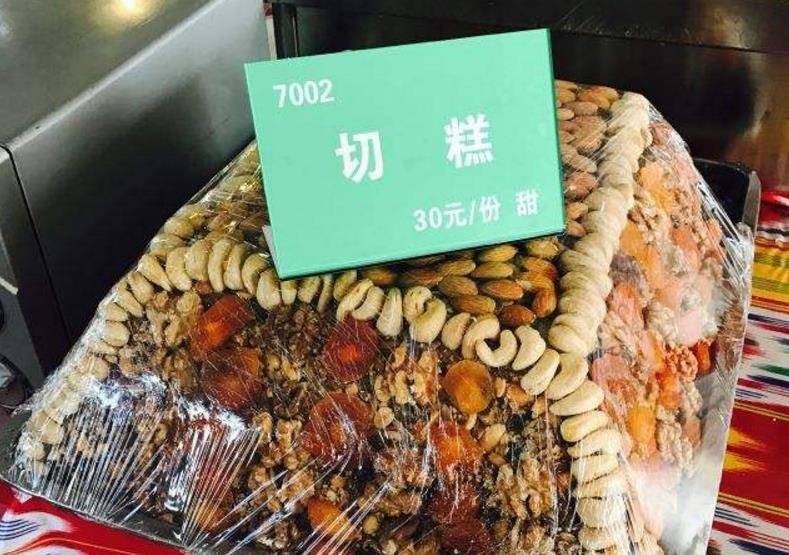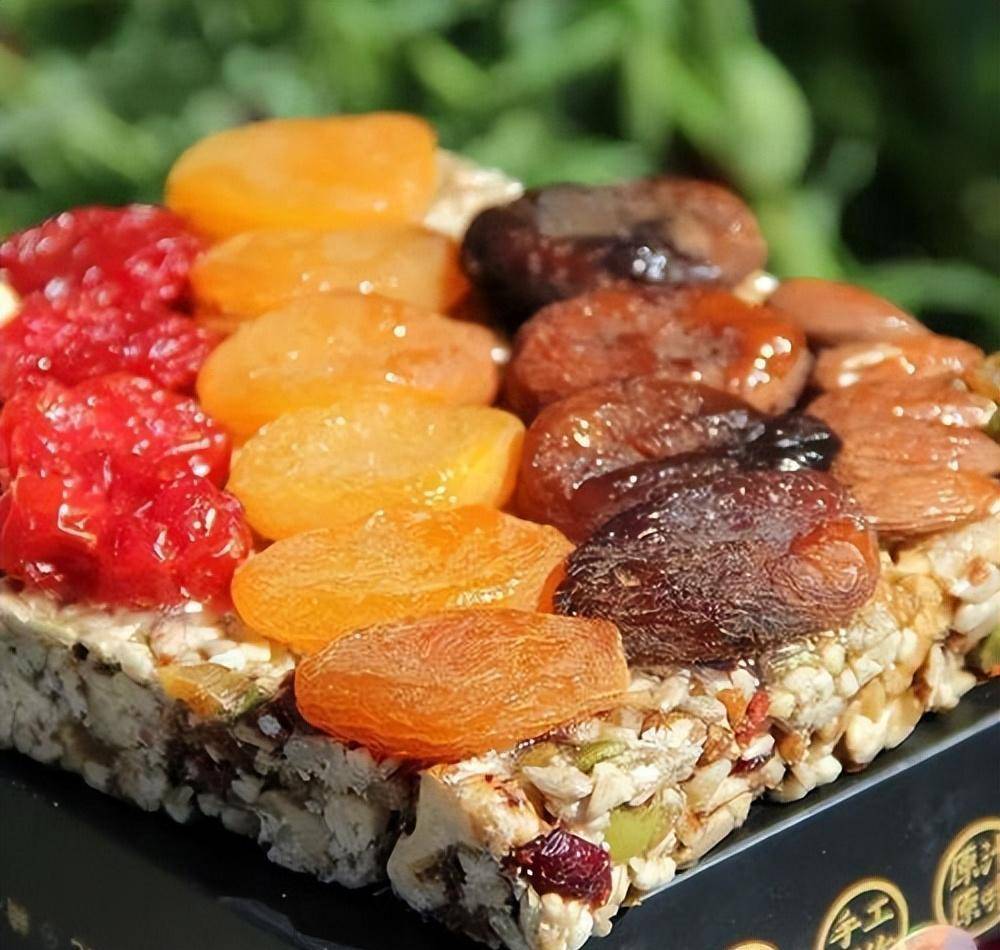 除了糯米粉、玉米面或小麦粉等材料之外,切糕的内部还会加入各种坚果、干果、蜜饯等辅料,如核桃仁、花生、葡萄干、桂圆干、巴旦木等等,这些辅料让切糕口感更加丰富。