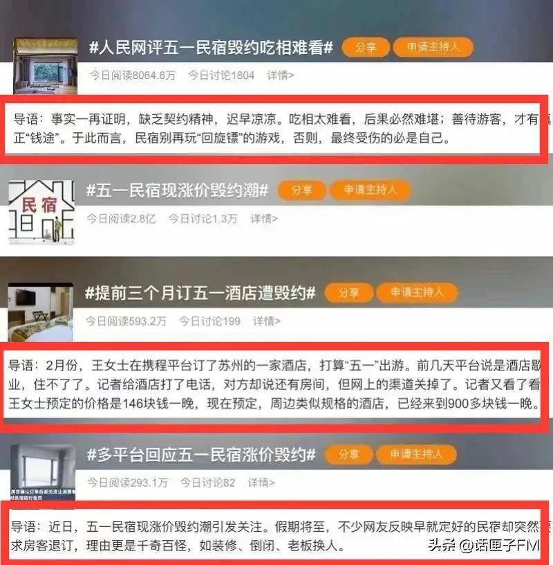 [1]随着五一假期的临近,加上近三年来的民宿预订高峰,目前的业主集体毁约涨价,部分房价涨幅达10倍。