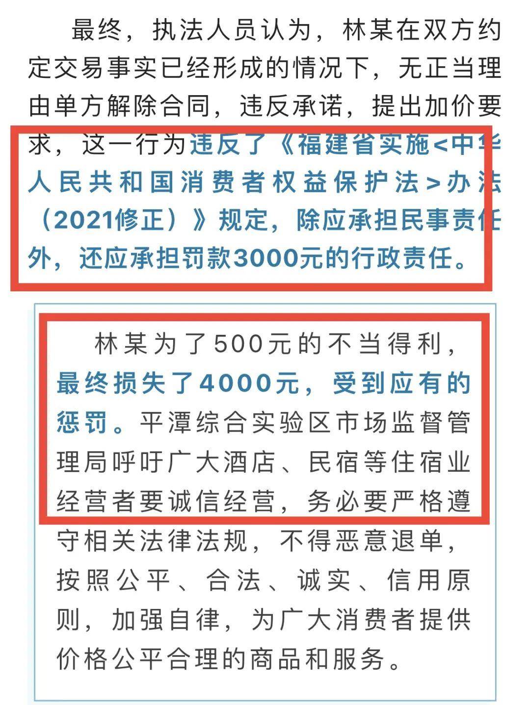 [8]无数游客被迫取消民宿预订:事件一:(化名)杨某2023年4月在福建平潭看到一家民宿,价格合理,5月1日假期订了4晚房,但4当月前十天,民宿老板通知游客(杨某)因民宿停电无法在5月1日假期入住预定房间,并要求杨某取消订单.杨游客不同意退单。双方协商未果,招待所老板单方面强行取消预订。l游客(杨某)下令,游客最终向当地文旅局投诉,相关部门介入调查。游客杨某的情况属实,客栈违约涨价。商家被罚款3000元,游客被赔偿1000元。由于小亏,业主赔了4000元多赚了500元。