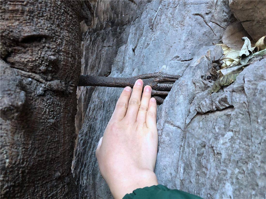 专家现场勘察后解释,这棵菩提树的树干上有许多二、动作枝条,枝条上有许多气生根,“手”就是其中之一。巧合的是,这只“手”的形状和真手非常相似,看起来像是在抓着悬崖。