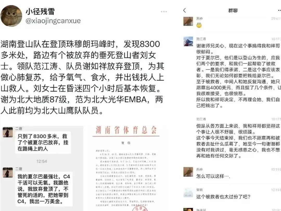 湖南登山领袖范江涛和谢如祥没想到刘女士是这样的人。他们勉强同意向导游支付4,000美元,并提出了一些附加条件。要知道,两人登山的准备,就是为了救刘女士,毁掉他们的登山梦。花费超过40万元。