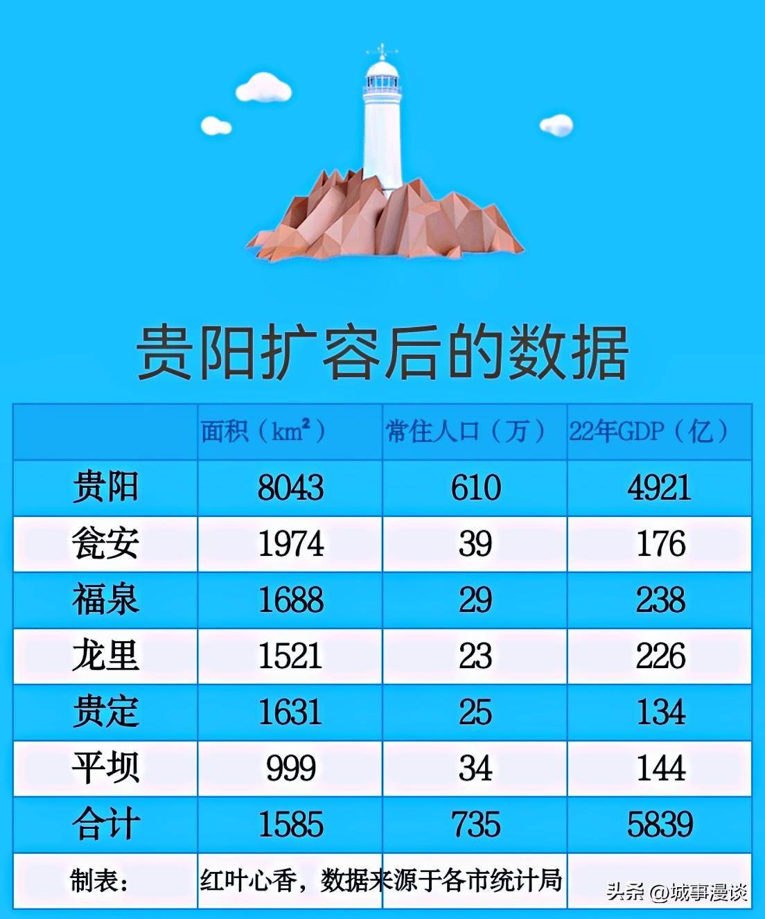 瓮安、福泉、龙里、贵定、平坝县划入贵阳后,贵阳市面积将增加到15856平方公里,常住人口将增加到735万。2023年经济总量为5839亿丹麦克朗。进入腰部城市行列,在全国城市中排名上升至第45位,进入全国经济体50强。随着贵阳版图的扩大,其经济实力也会相应增强。区域分工协调和辐射带动作用也将得到加强,有利于贵阳省和贵州省经济协调发展。
