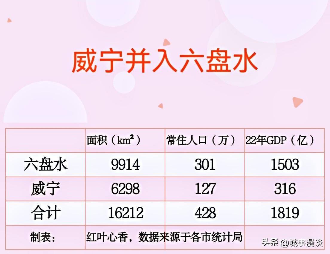 威宁划入六盘水市后,新六盘水市面积16212平方公里,常住人口428万,2023年国内生产总值1819亿元,经济总量跻身全国前五贵州省地级市。此外,六盘水区位优势也将得到增强,对区域经济协调发展起到积极作用。