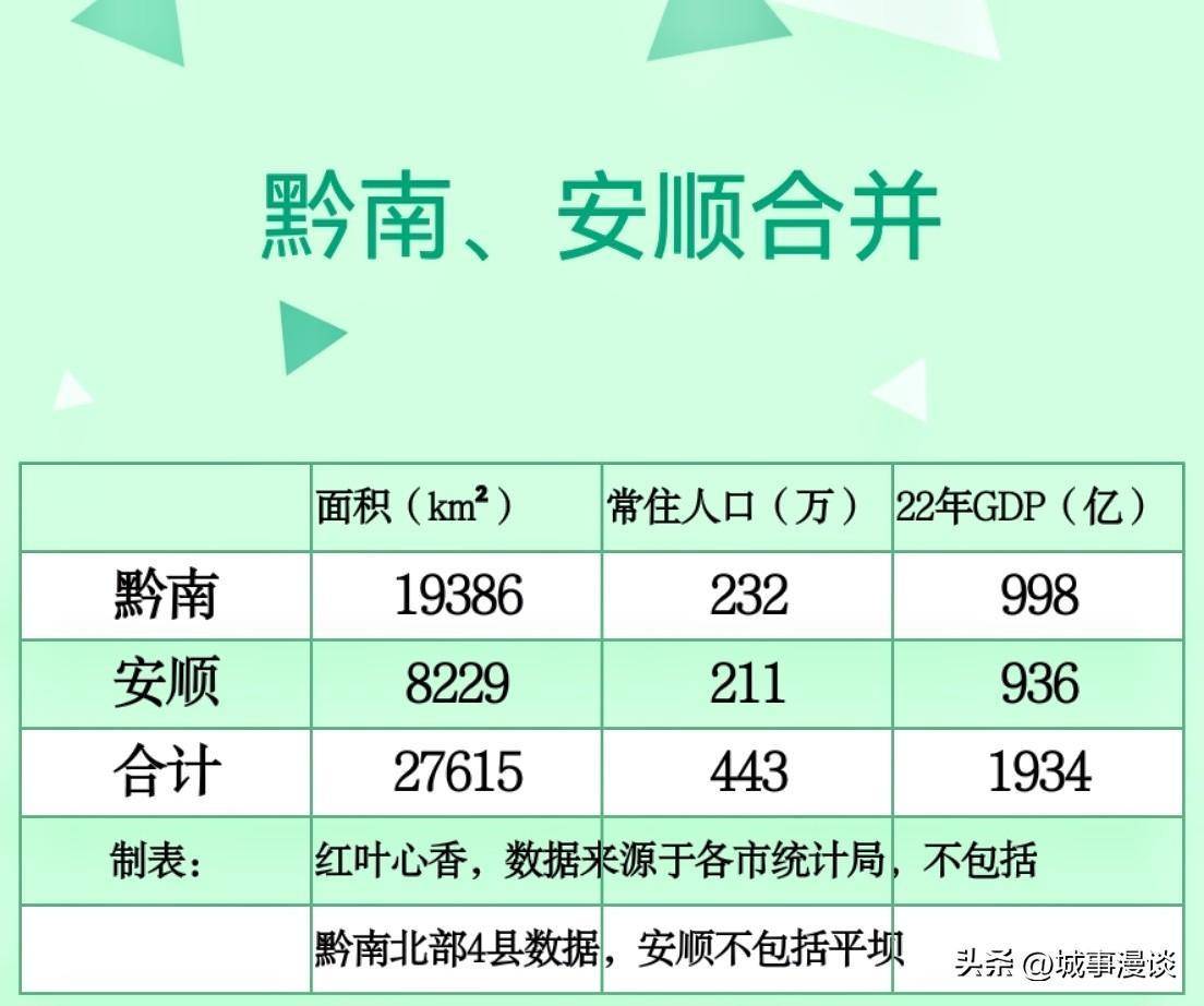安顺并入黔南州后(不含平坝县及黔南州北部四县),新黔南州面积27615平方公里(比现面积扩大约1400平方公里),而常住人口将达到443万,2023年经济总量将达到1934亿元。如此一来,黔南州的发展空间、区位优势和经济实力将得到极大提升,有利于黔南州建设省会城市,打造辐射带动黔南发展的引擎。