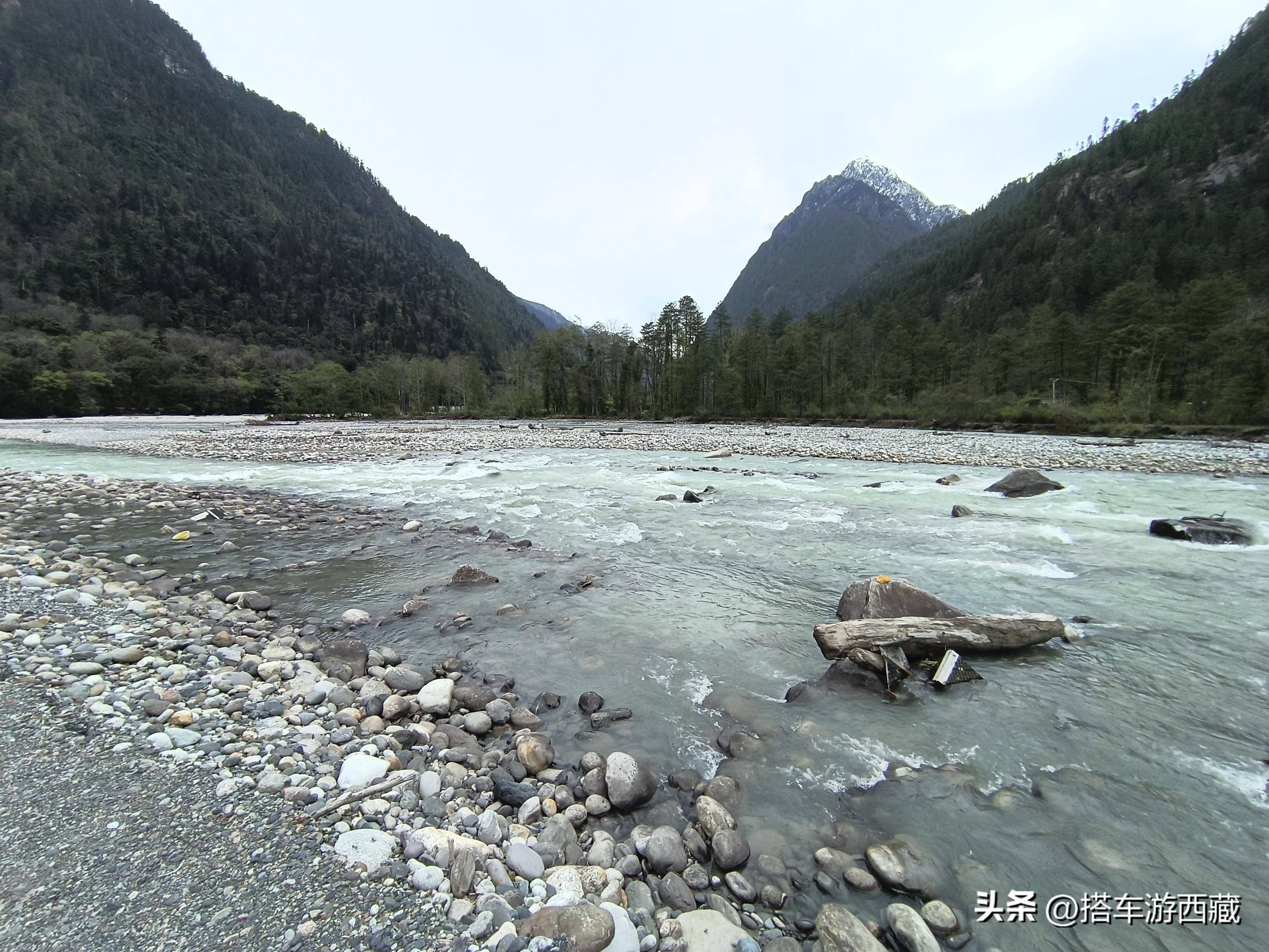 突然,我听到了清脆悦耳的流水声,就像那天早上临济的雨水打在帐篷里的声音。于是顺着声音往林子深处钻去。这里没有办法。如我所见,它流了一圈又一圈,河的尽头是一座雪山。在藏区看到雪山并不新鲜,但如果在这郁郁葱葱的绿色森林中出现雪山,还是让人有些意外。