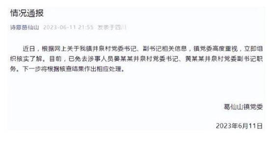 2023年6月11日,四川彭州葛仙山镇党委发布了一份重要的《情况通报》。此次通报涉及井泉村党委书记、副书记的相关信息。针对网络上的有关传闻,葛仙山镇党委高度重视,立即组织核实了解。经过核查,已经确认情况属实,镇党委对涉事人员晏某某井泉村党委书记、黄某某井泉村党委副书记免去职务。下一步,根据核查结果将会作出相应处理。