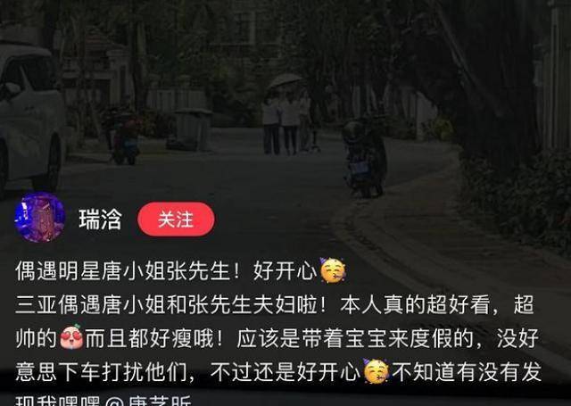1月11日,一位网民播放了一段自己在三亚与张若昀及妻子唐艺昕携带女儿在三亚游玩的视频。在视频中,这位网民透露,他们两人特别瘦并且很漂亮,应该是带孩子去三亚度假的。